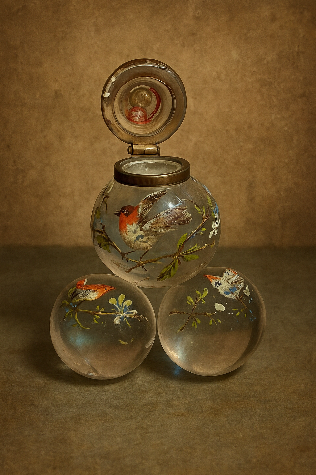This glass perfume bottle isn’t just a container — it’s a poetic glimpse into a time when every object was a work of art. The trio of globes represents harmony and balance, while the painted birds add a lyrical touch of nature and nostalgia.