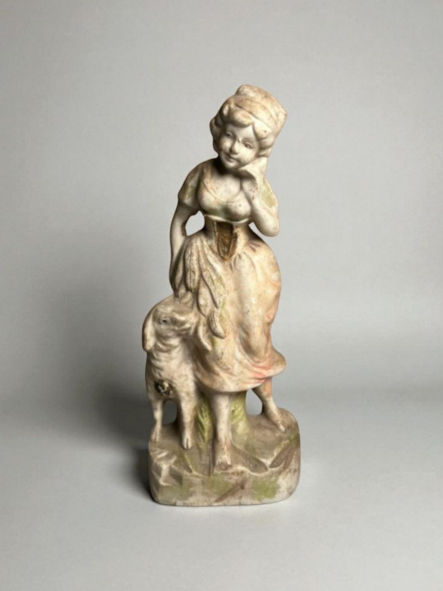 This charming Japanese bisque figurine depicts a young village lady standing beside a lamb — symbolizing innocence and pastoral beauty.