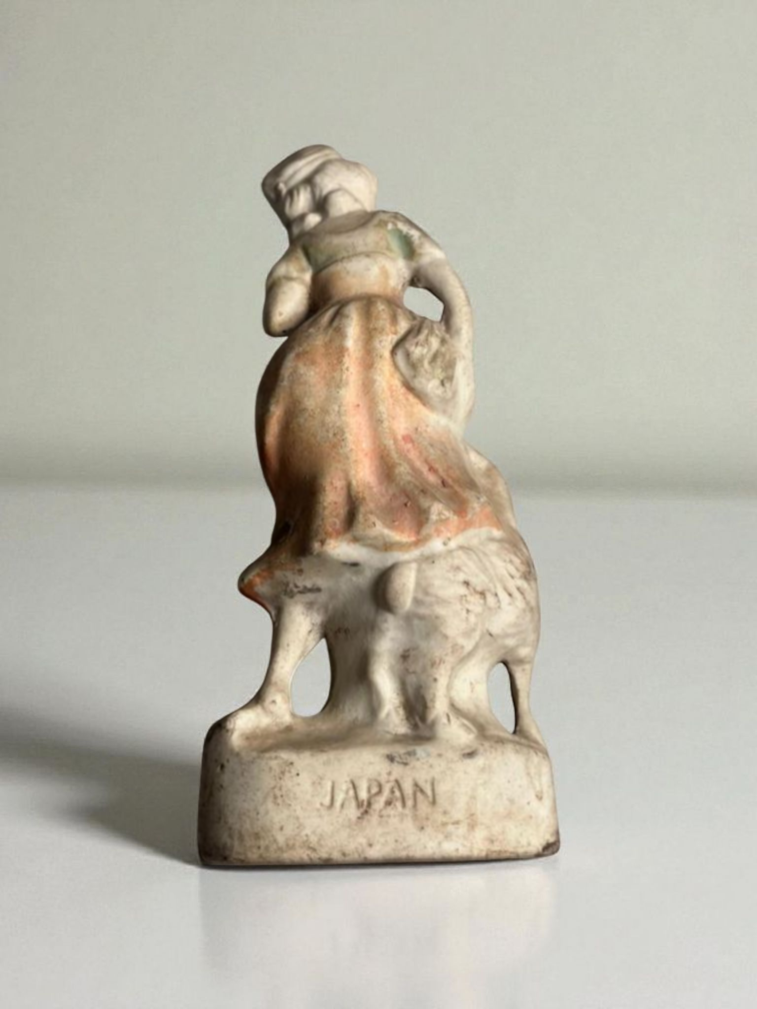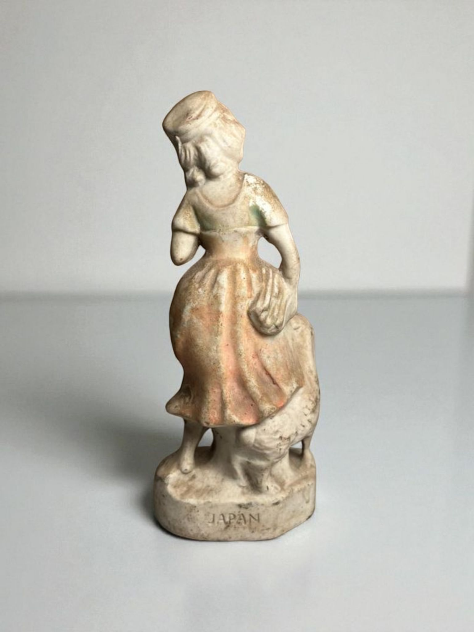 Stamped “JAPAN” at the base, it likely dates to 1930s–1950s, when Japan exported decorative bisque figurines worldwide.