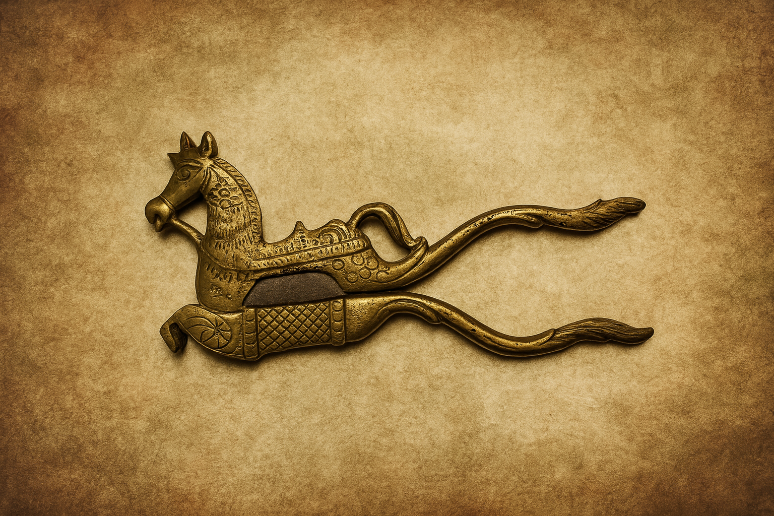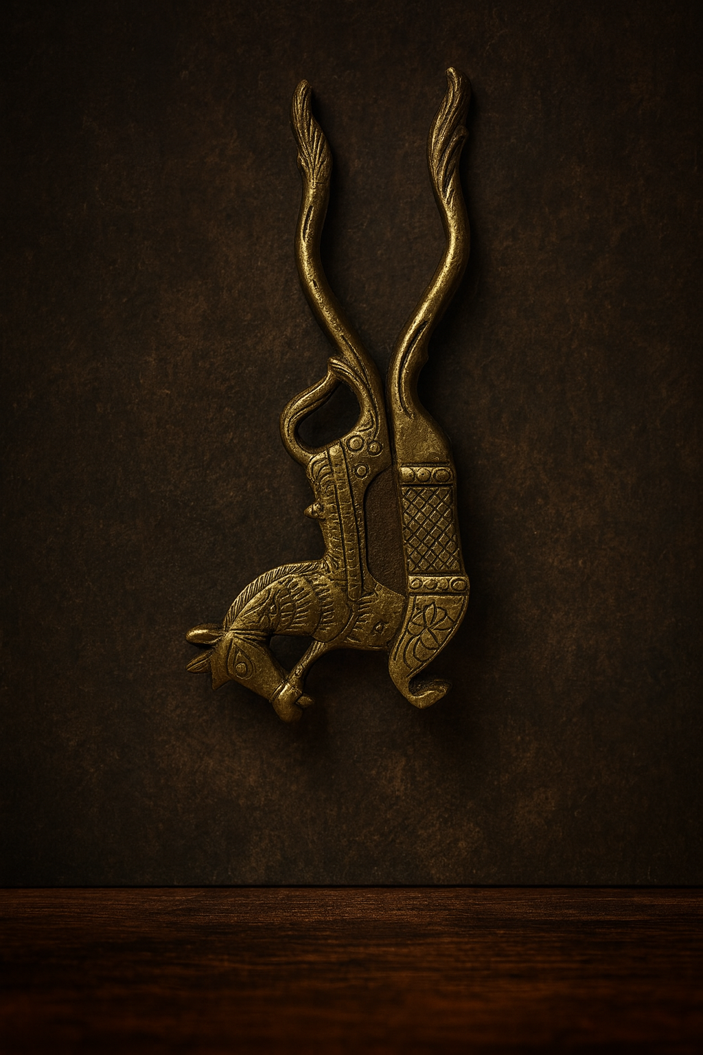 A magnificent and rare antique brass nut cutter crafted in the shape of a beautifully carved horse. This unique piece represents traditional Indian craftsmanship where everyday tools were artistically designed and hand-cast in solid brass. The body of the nut cutter features detailed engravings, floral motifs, and a sculpted horse head, while the long handles curve like flowing mane and tail — making it a stunning piece of functional art.