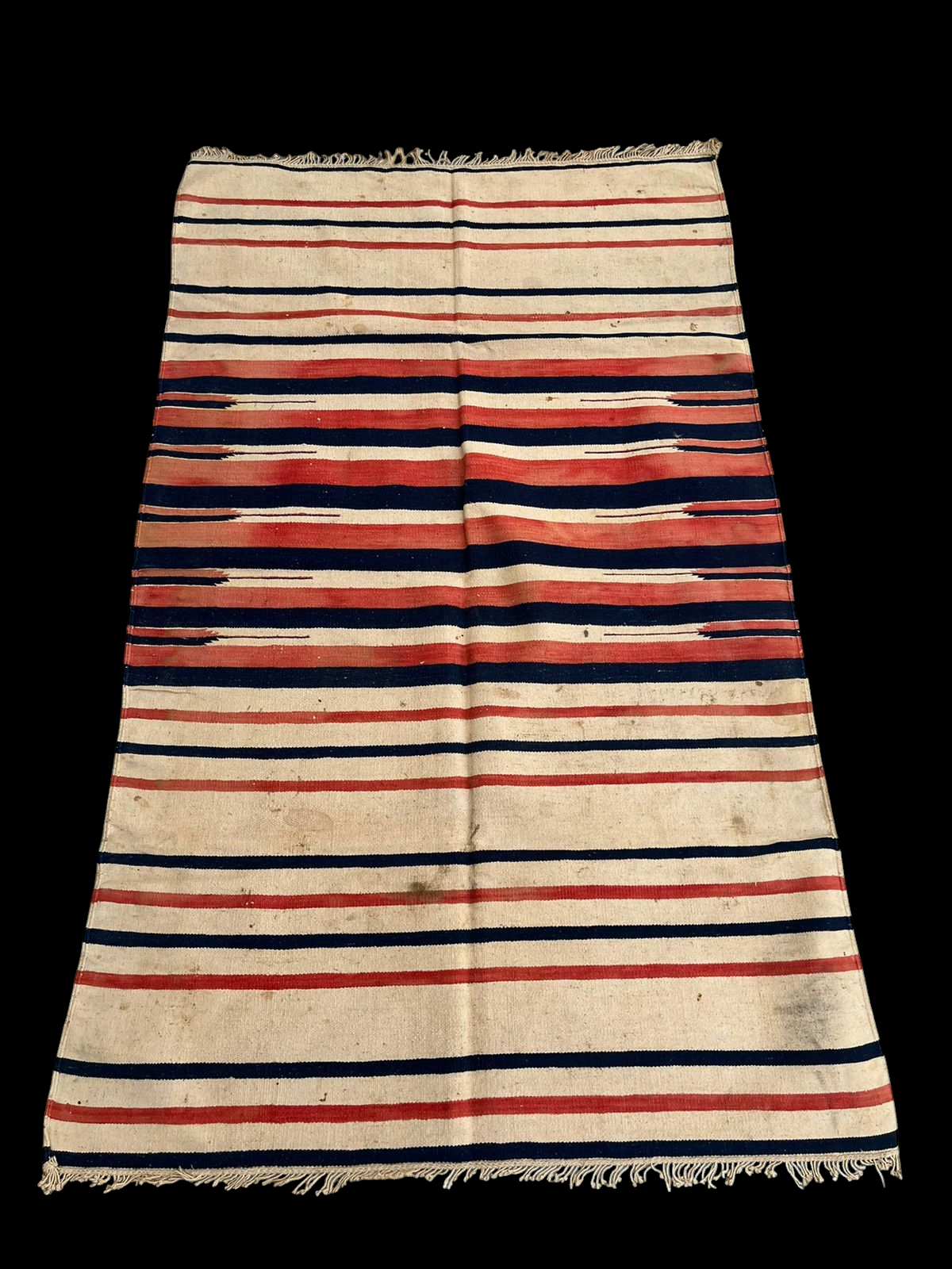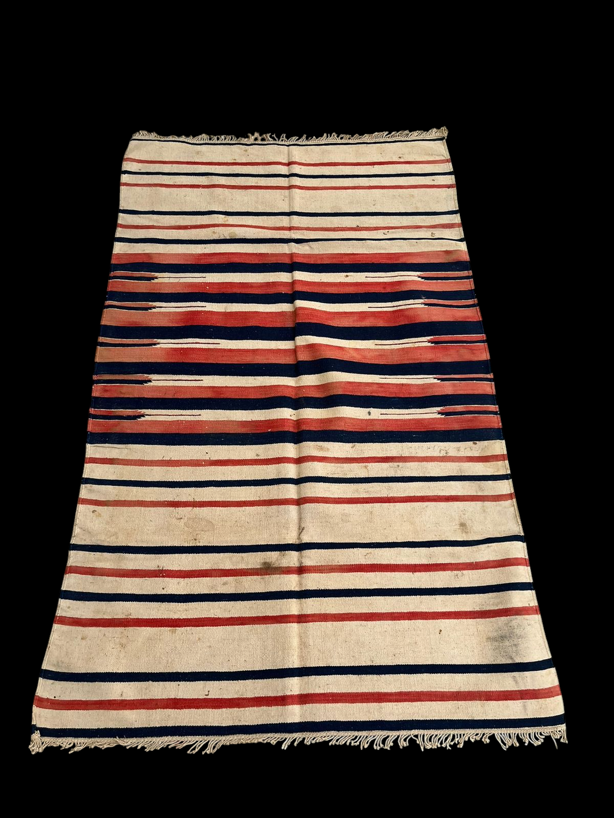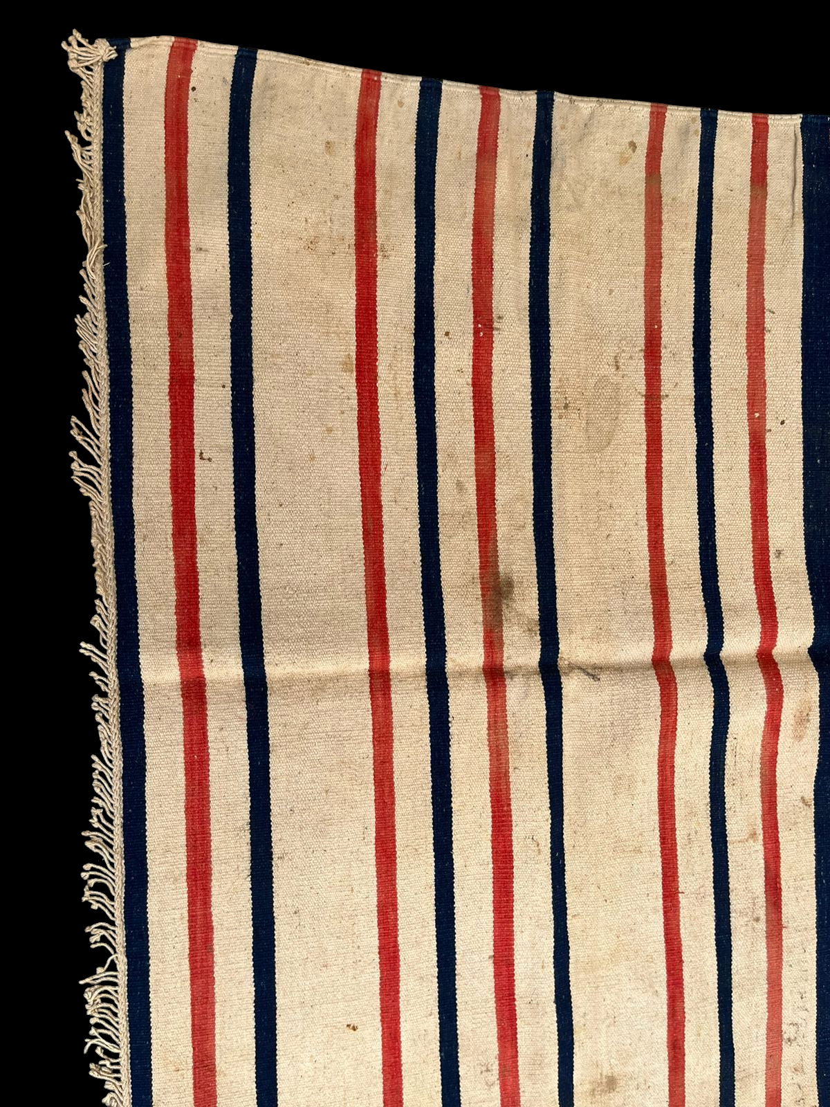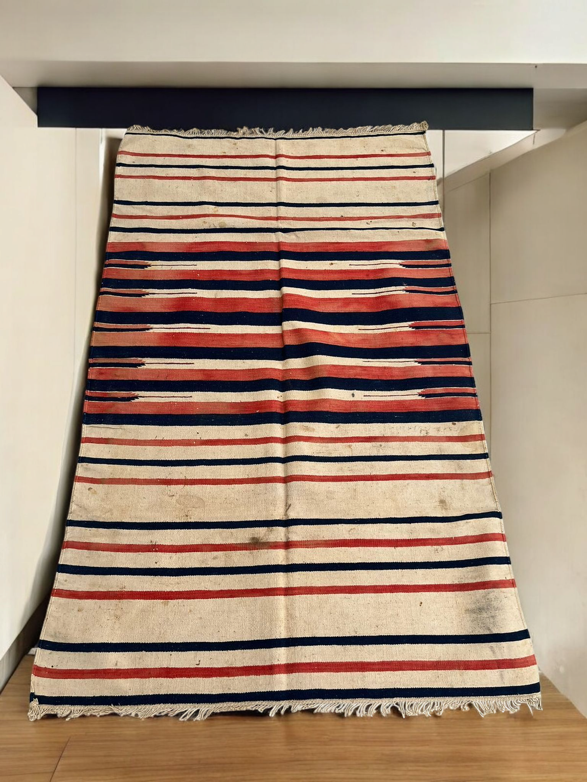 Step into the past with this exceptionally rare Bikaner Jail handwoven rug, crafted over a century ago by inmates under the royal prison weaving program of Bikaner, Rajasthan. Featuring bold red and indigo stripes on a natural cotton base, this rug is a true testament to India’s prison craftsmanship legacy, once encouraged by princely states to rehabilitate inmates through skilled handloom work.