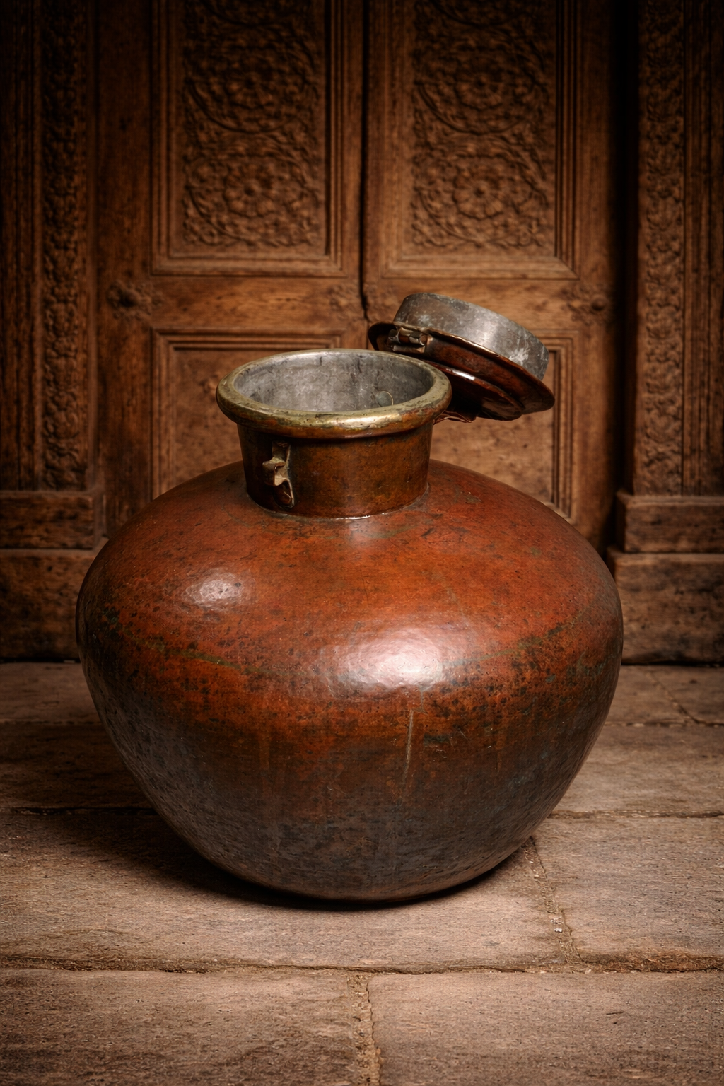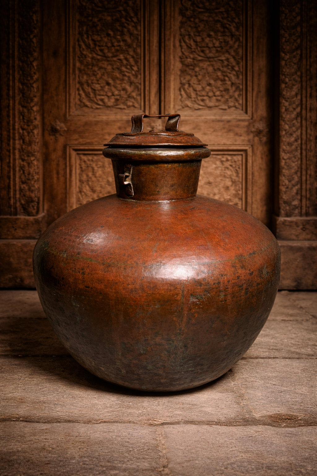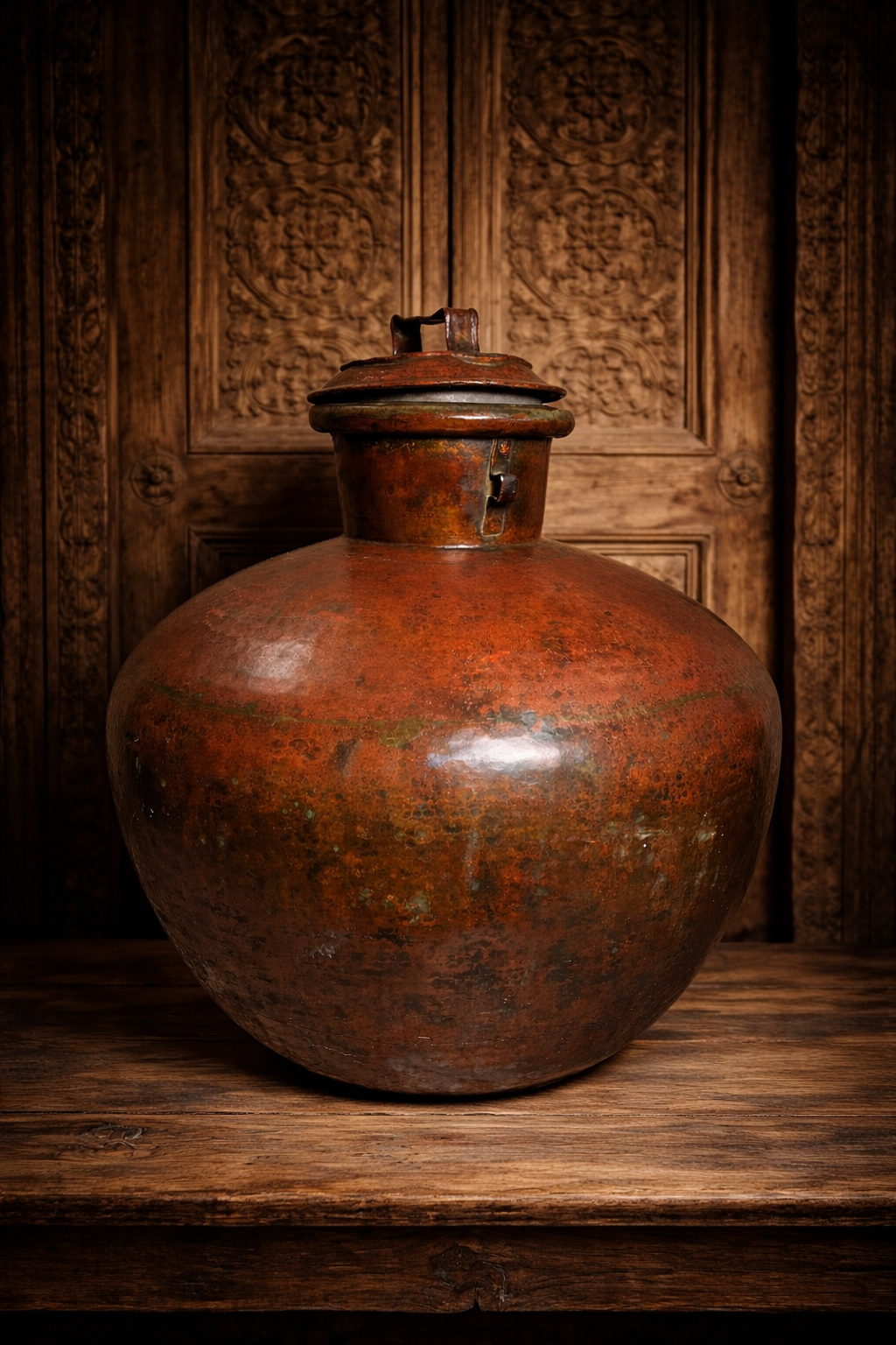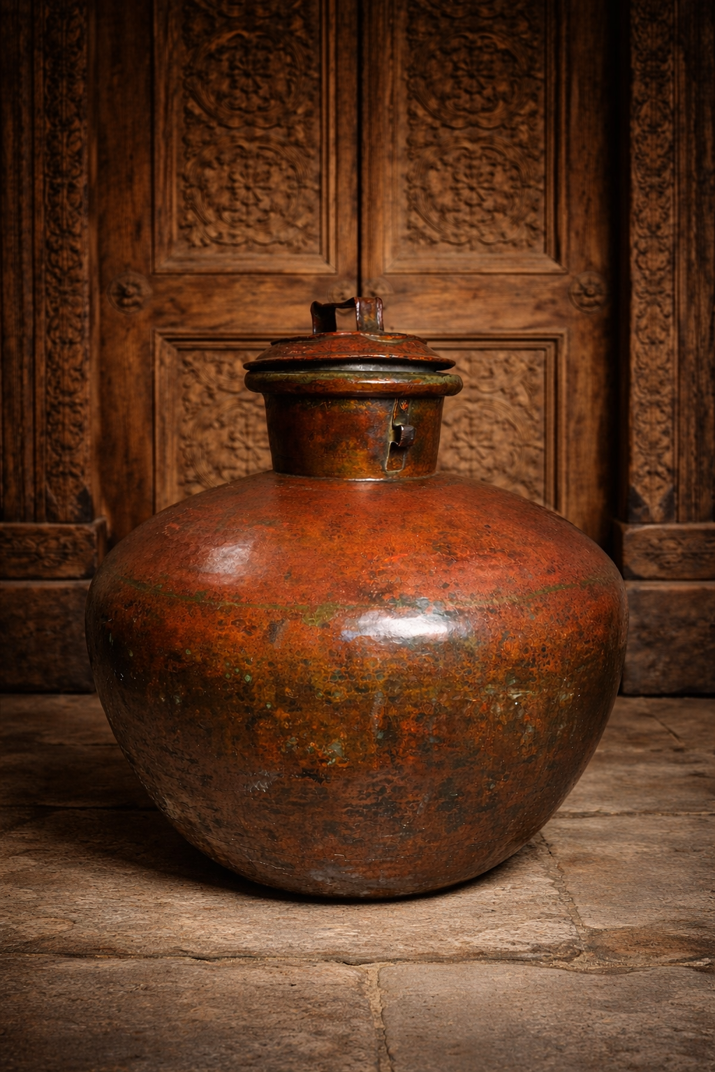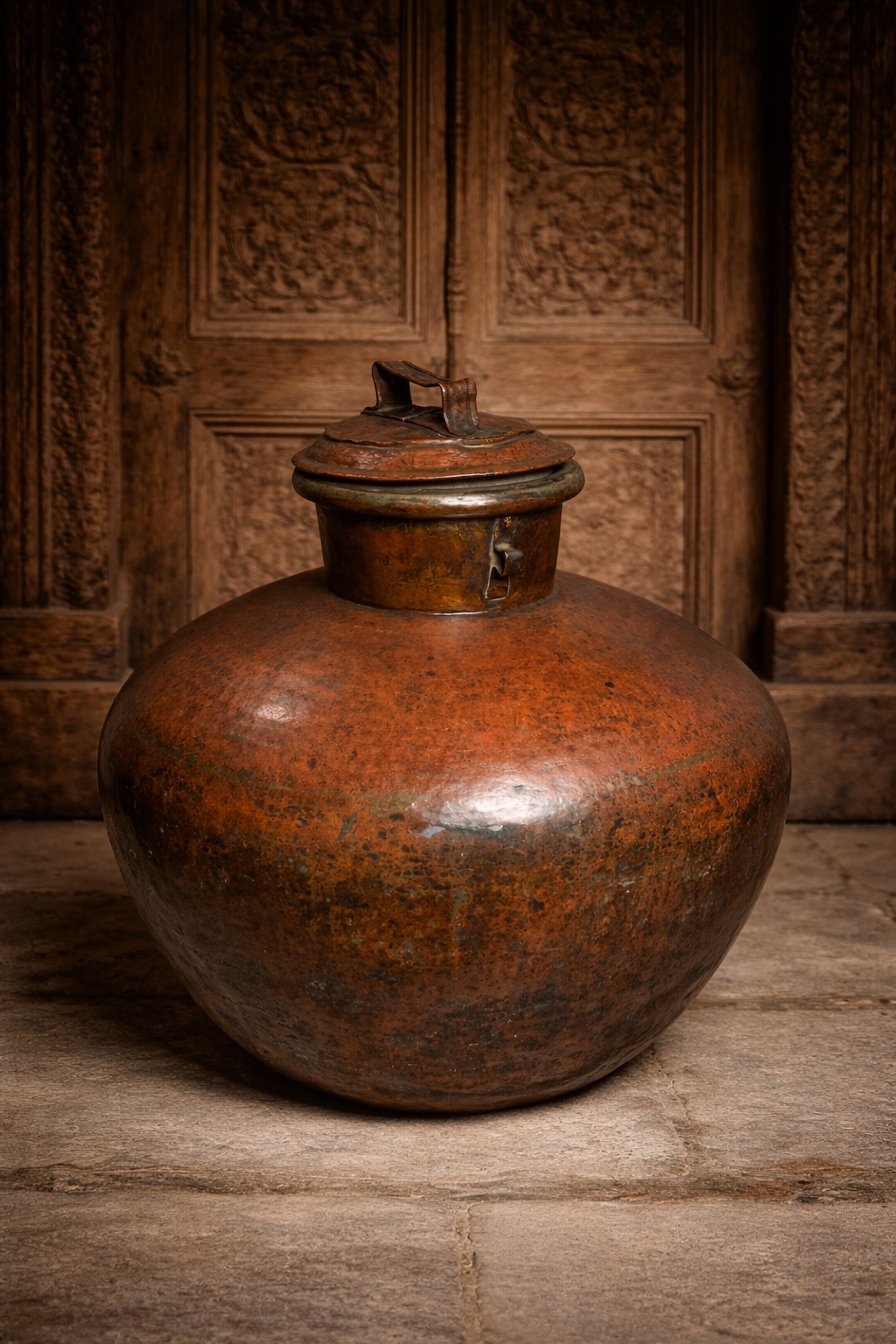 The Charu features a large rounded body with its original lid and locking latch, a design traditionally used in royal households and traditional Indian homes for storing water, grains, or ceremonial offerings. Over more than a century, the copper has developed a beautiful natural reddish-brown patina, giving the piece a remarkable antique character.