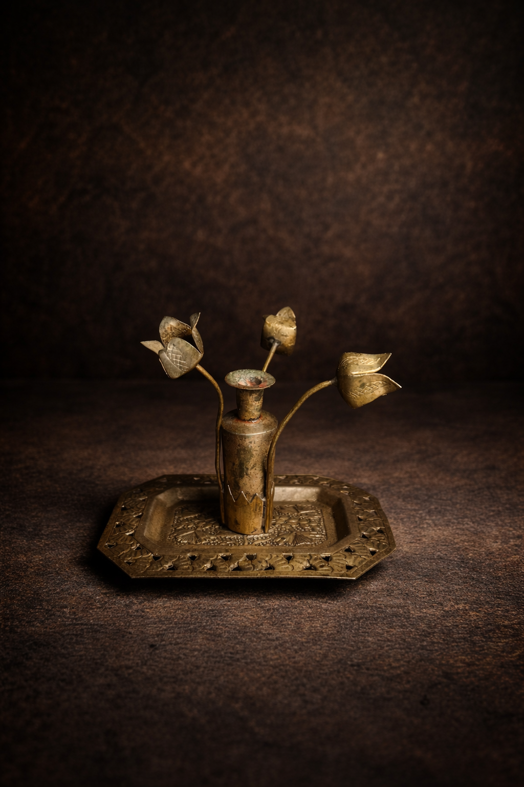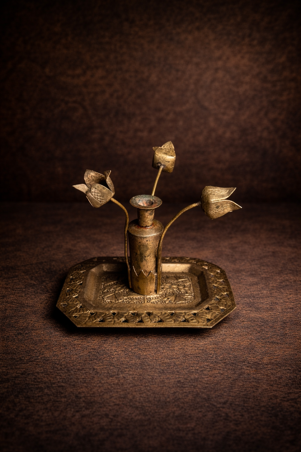 A handcrafted brass incense holder with an accompanying tray, detailed with floral motifs in relief. Designed to support incense sticks or cones, this decorative piece reflects traditional brass metalwork and refined artisanal engraving. As an antique décor element, it represents heritage decorative ware suitable for curated interiors or collections.