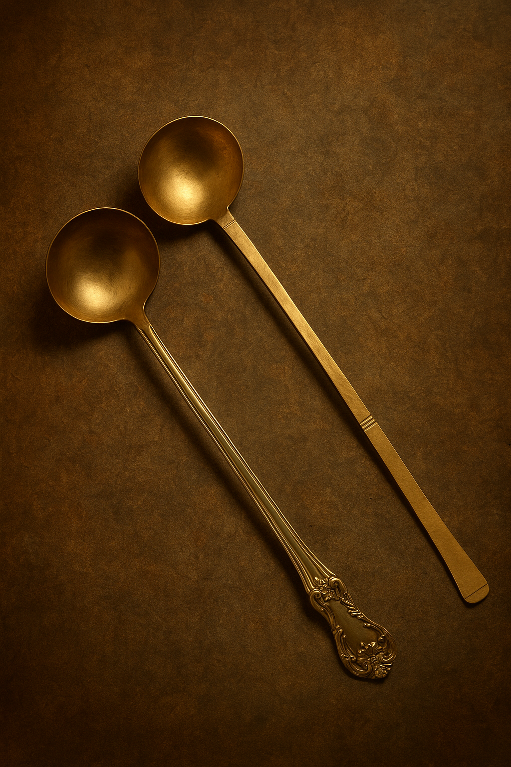 This exquisite pair of Antique Brass Ladles represents India’s rich culinary heritage. Handcrafted decades ago, each ladle carries a warm golden patina achieved naturally over time. One piece features a minimal straight-handle design, while the second showcases ornate floral carving on the handle, adding a touch of royal artistry.
