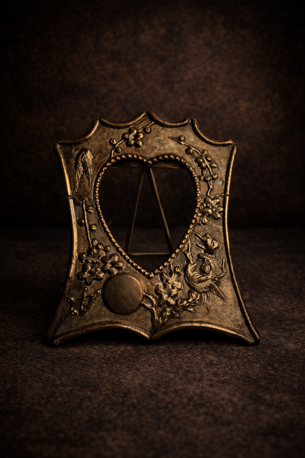 Antique Brass Photo Frame with Silver Polish (Heart Design | Embossed Floral & Bird Work)