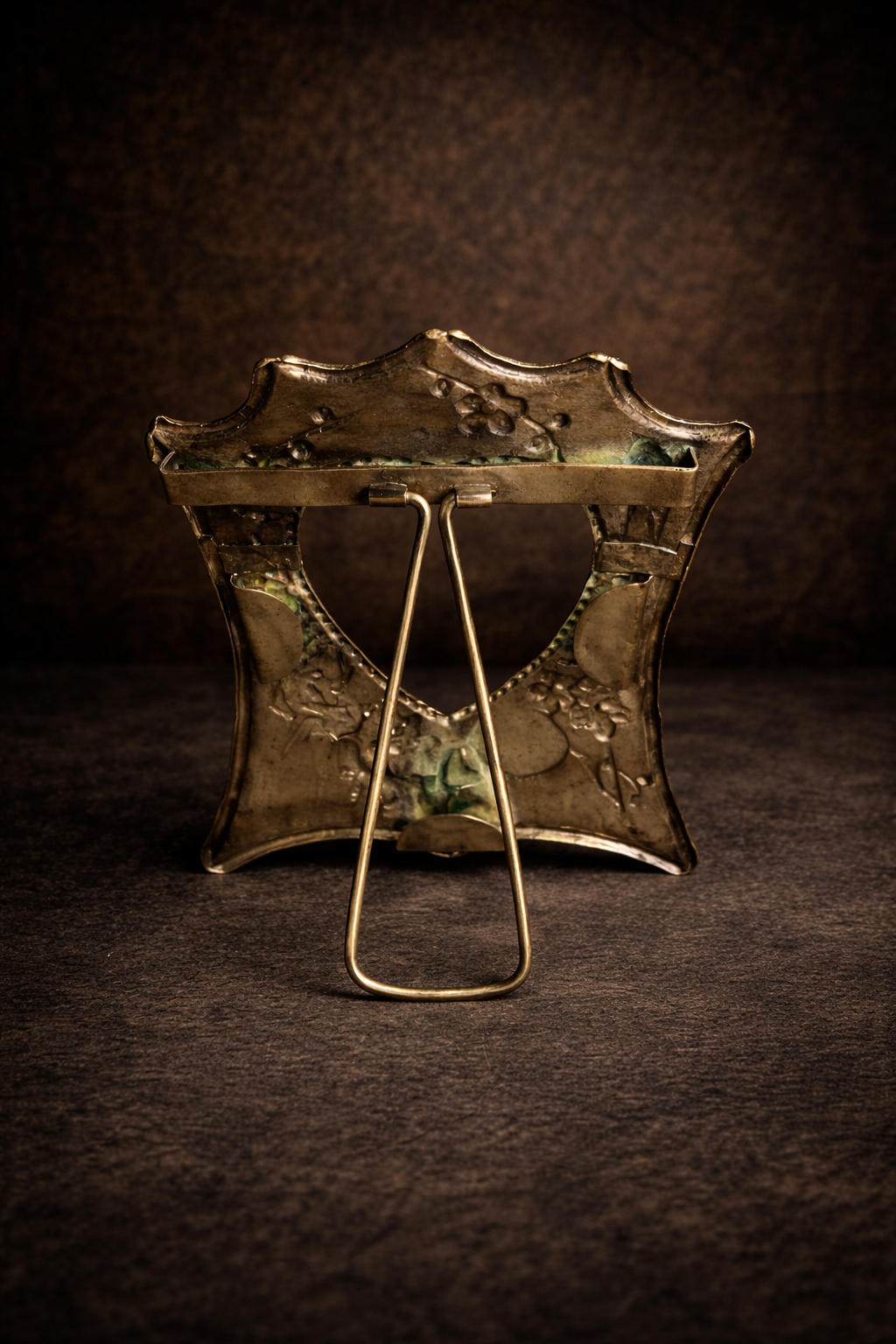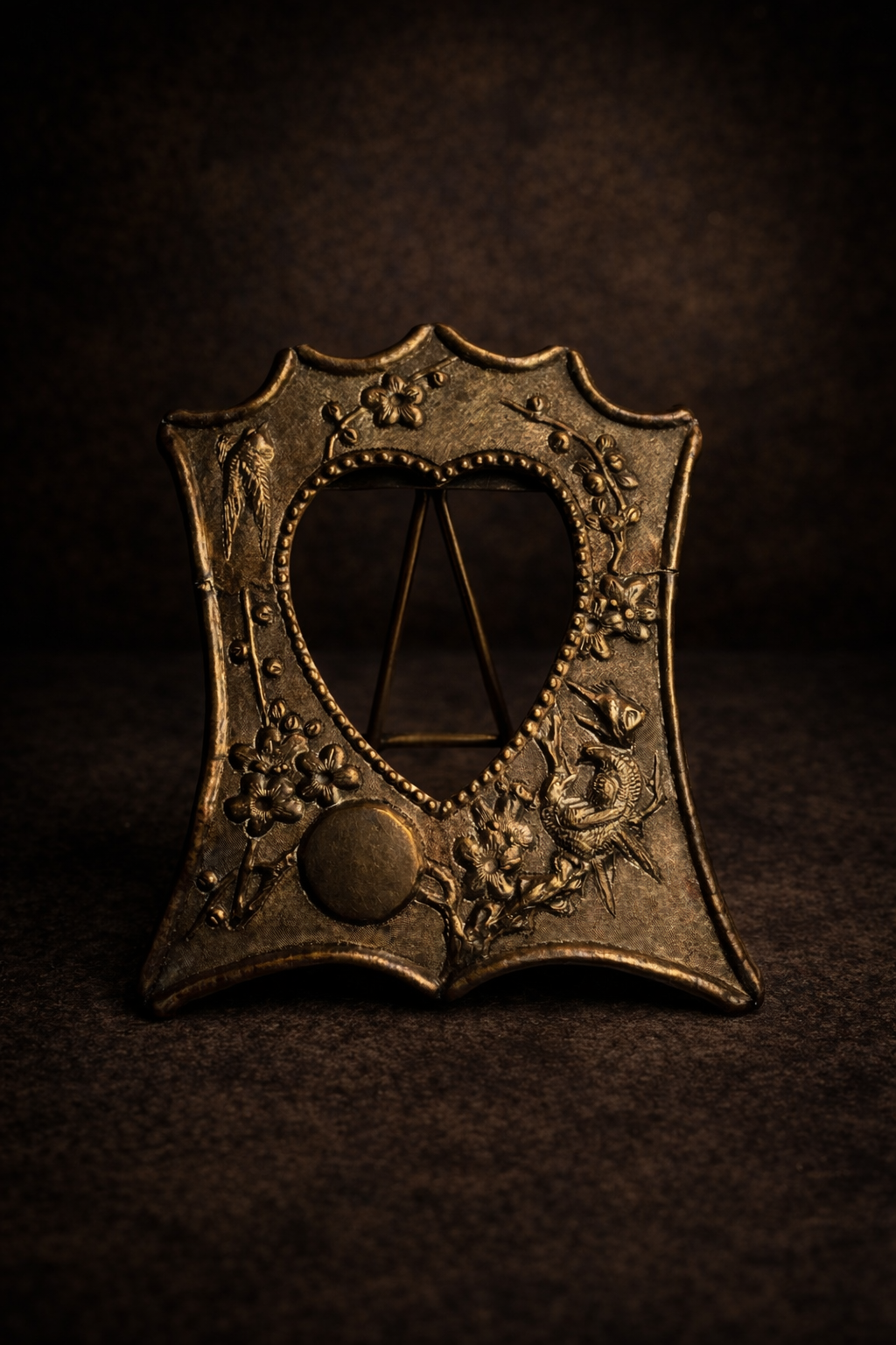 Presenting a rare and elegant antique brass photo frame, finished with a beautiful silver polish that enhances its vintage charm and depth. This finely crafted piece features a distinctive heart-shaped display window, surrounded by intricate hand-embossed floral and bird motifs, reflecting traditional craftsmanship and artistic detailing.