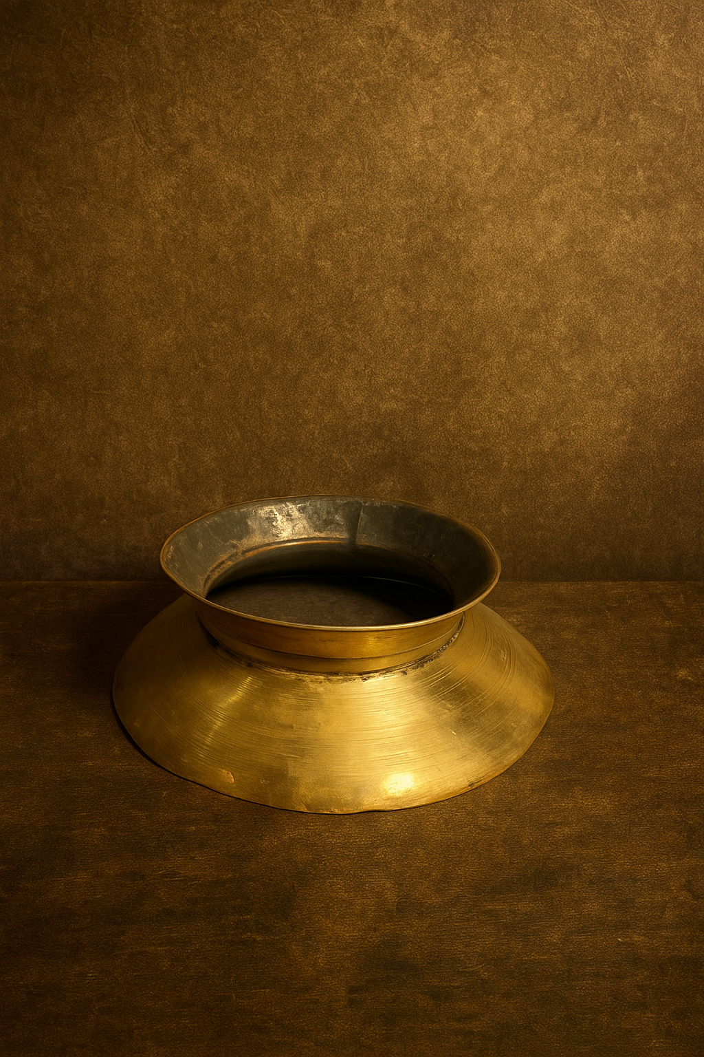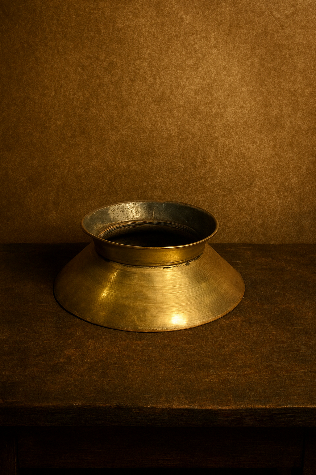 This Antique Brass Pot Stand is an authentic traditional Indian vessel base crafted from solid brass. Its wide conical form offers excellent stability, making it ideal for holding heavy pots, kalash, cooking degchis, or ritual containers.