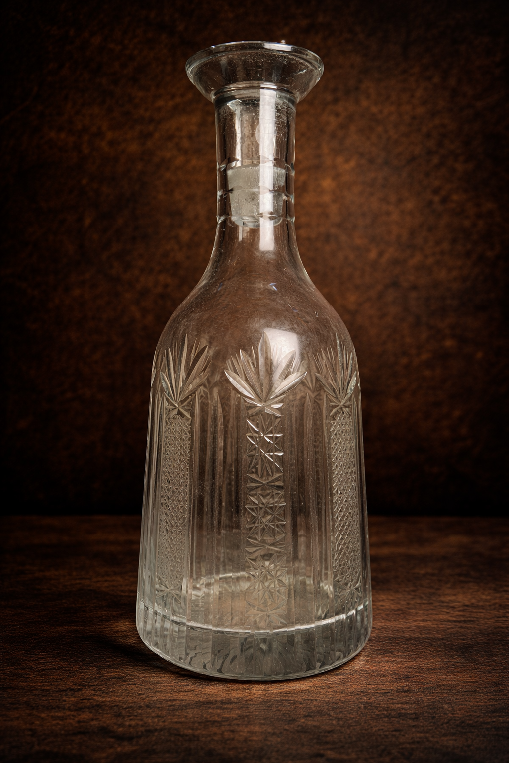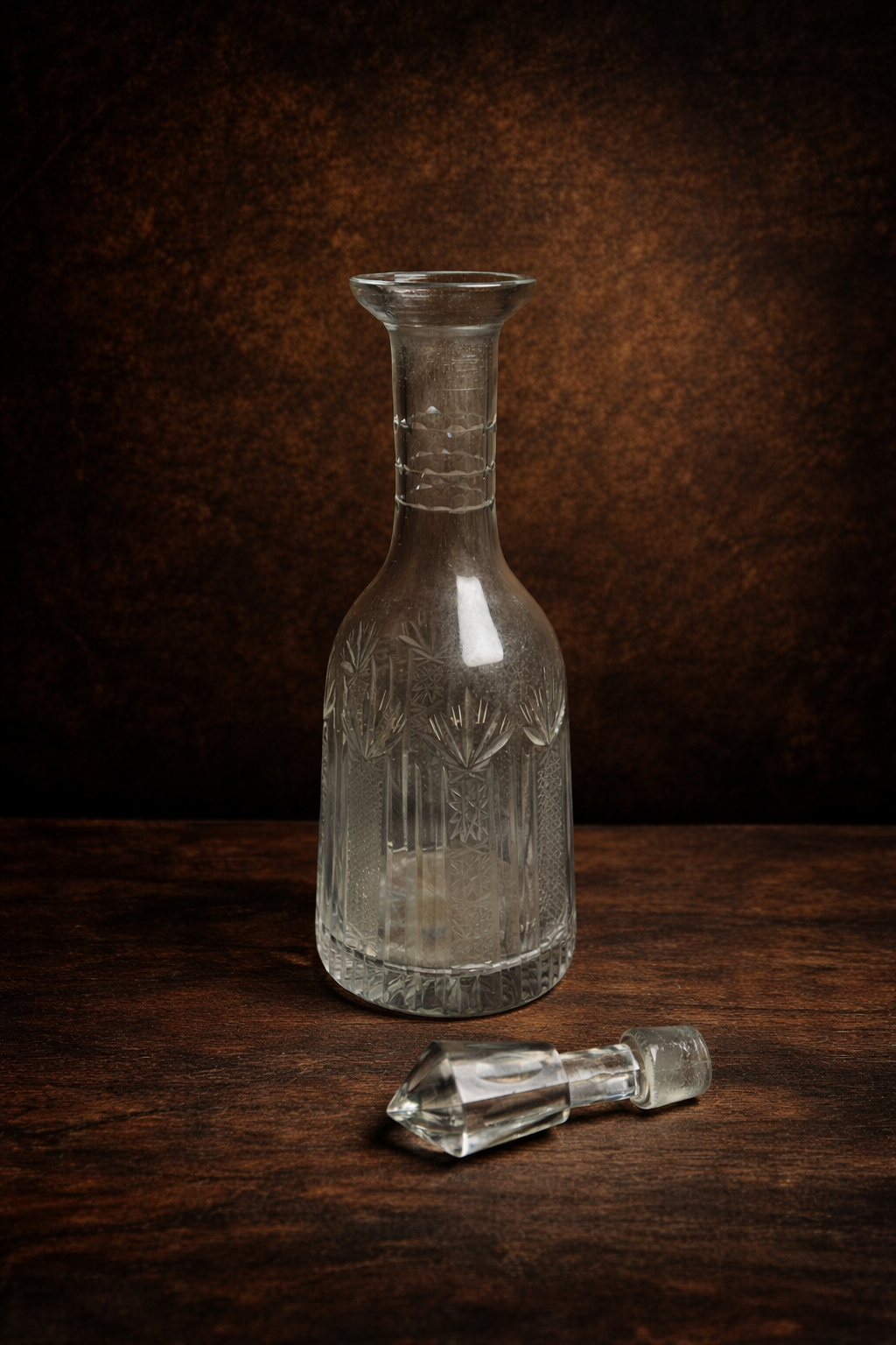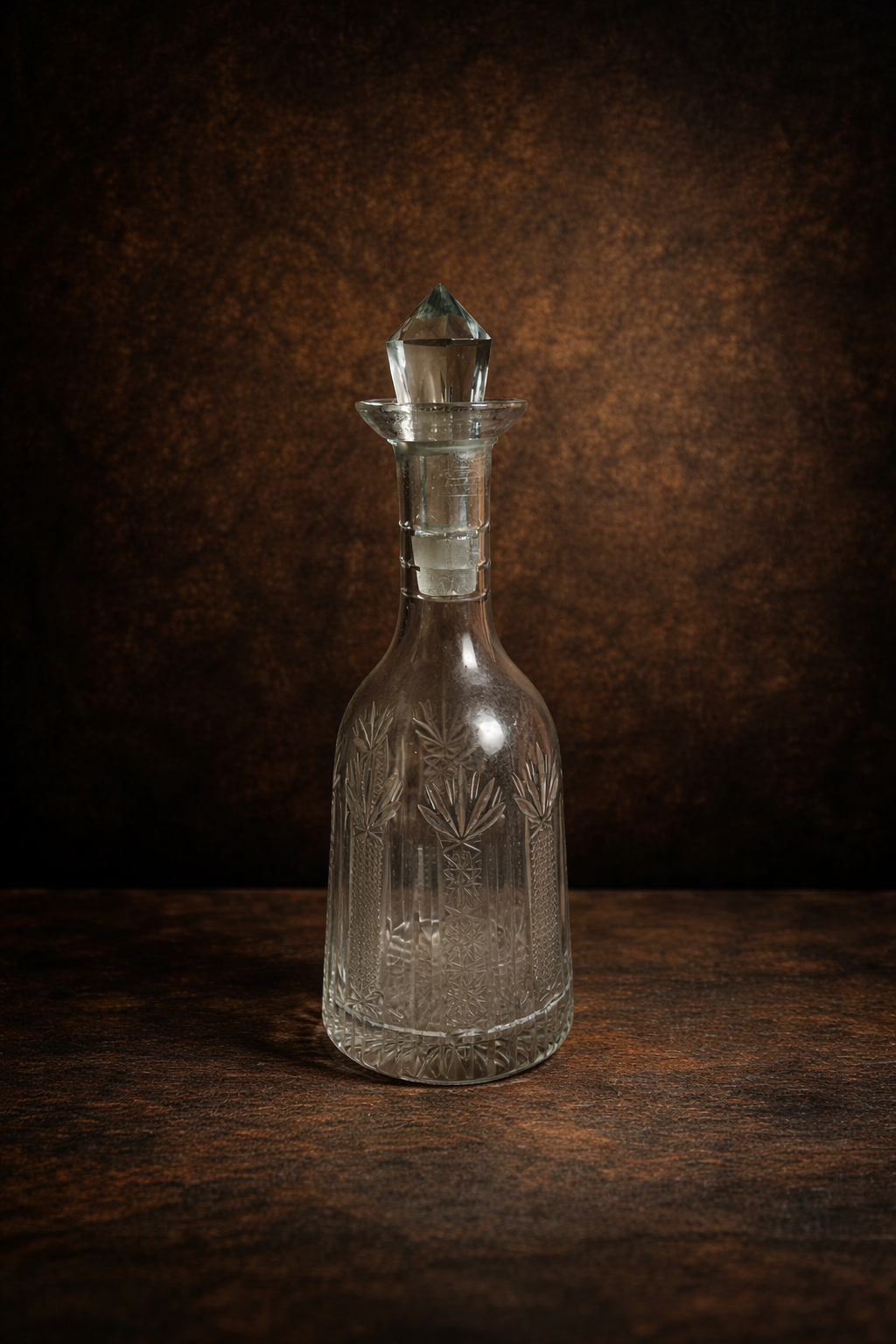 A beautifully crafted antique cut glass decanter / perfume bottle, featuring elegant hand-cut detailing with symmetrical floral and geometric patterns.