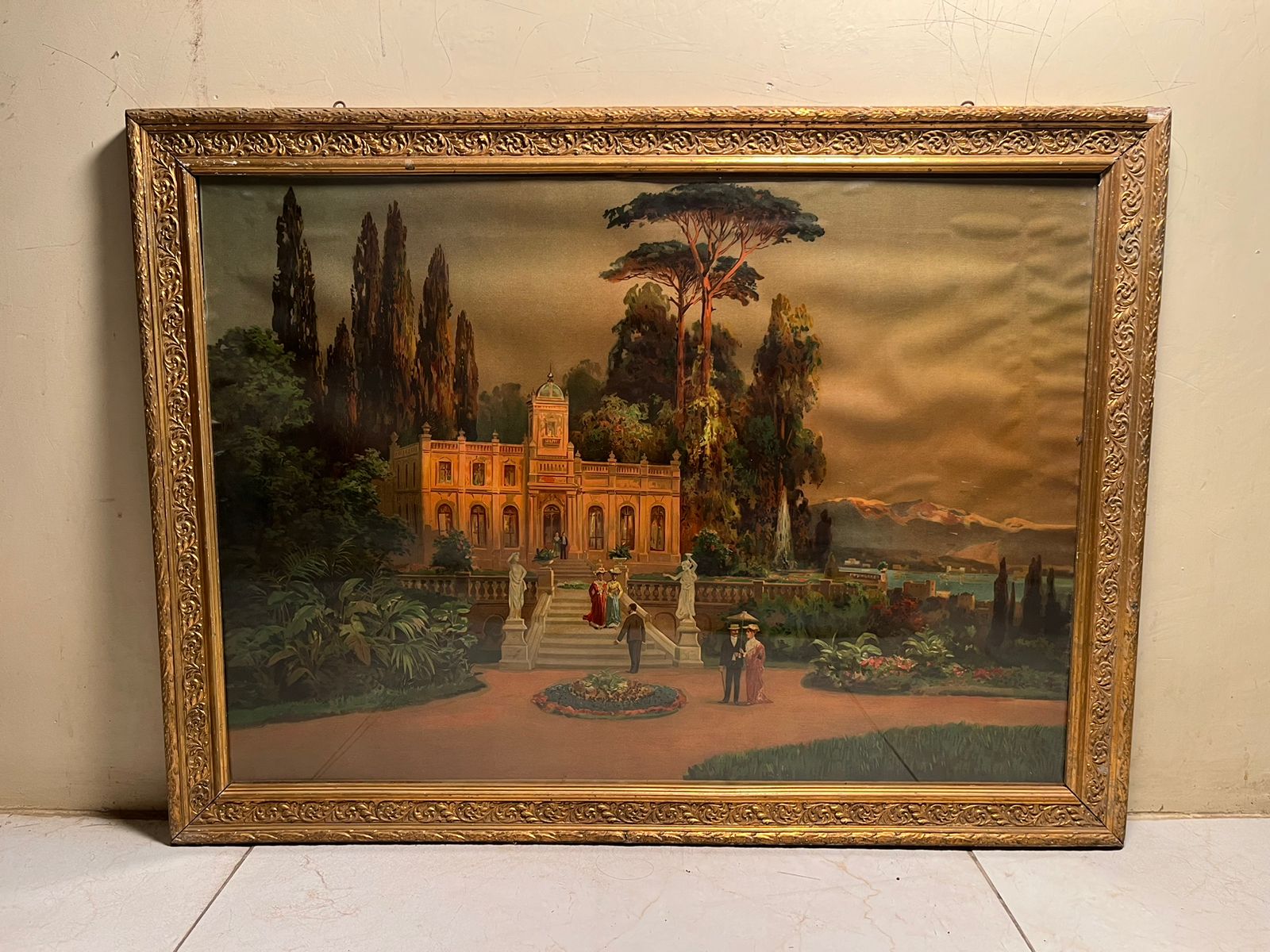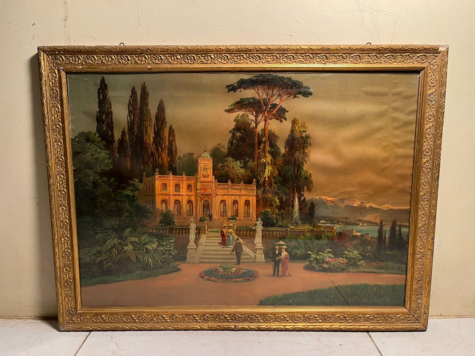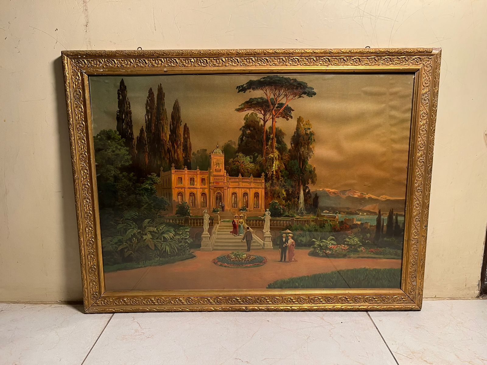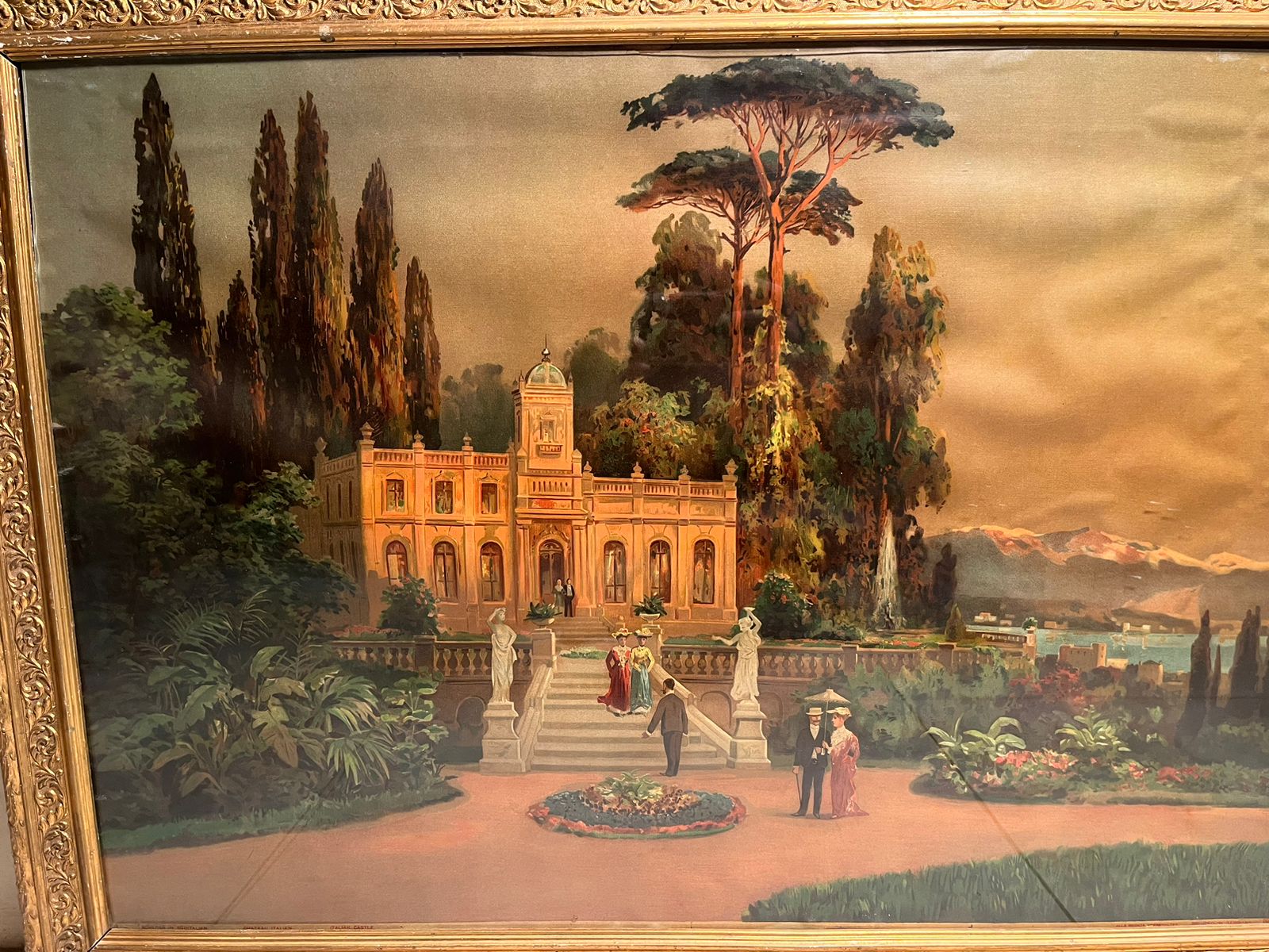 This is a stunning 120+ year old European oleograph print, featuring a grand palace landscape scene surrounded by lush gardens, classical architecture, and distant scenic views.