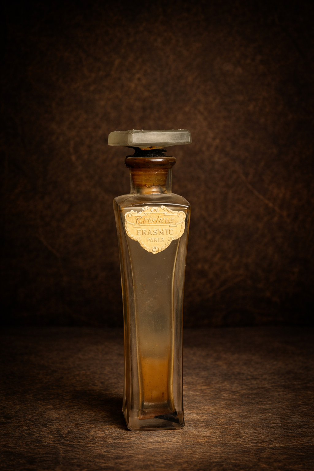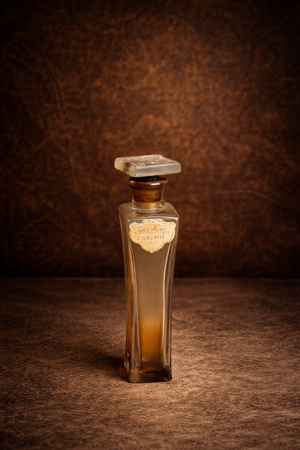 Presenting a rare and elegant antique French perfume bottle from the early 20th century, marked “Krishna – Erasmic Paris”. This exquisite piece reflects the golden era of European perfumery, when glass craftsmanship and fragrance artistry were at their peak.