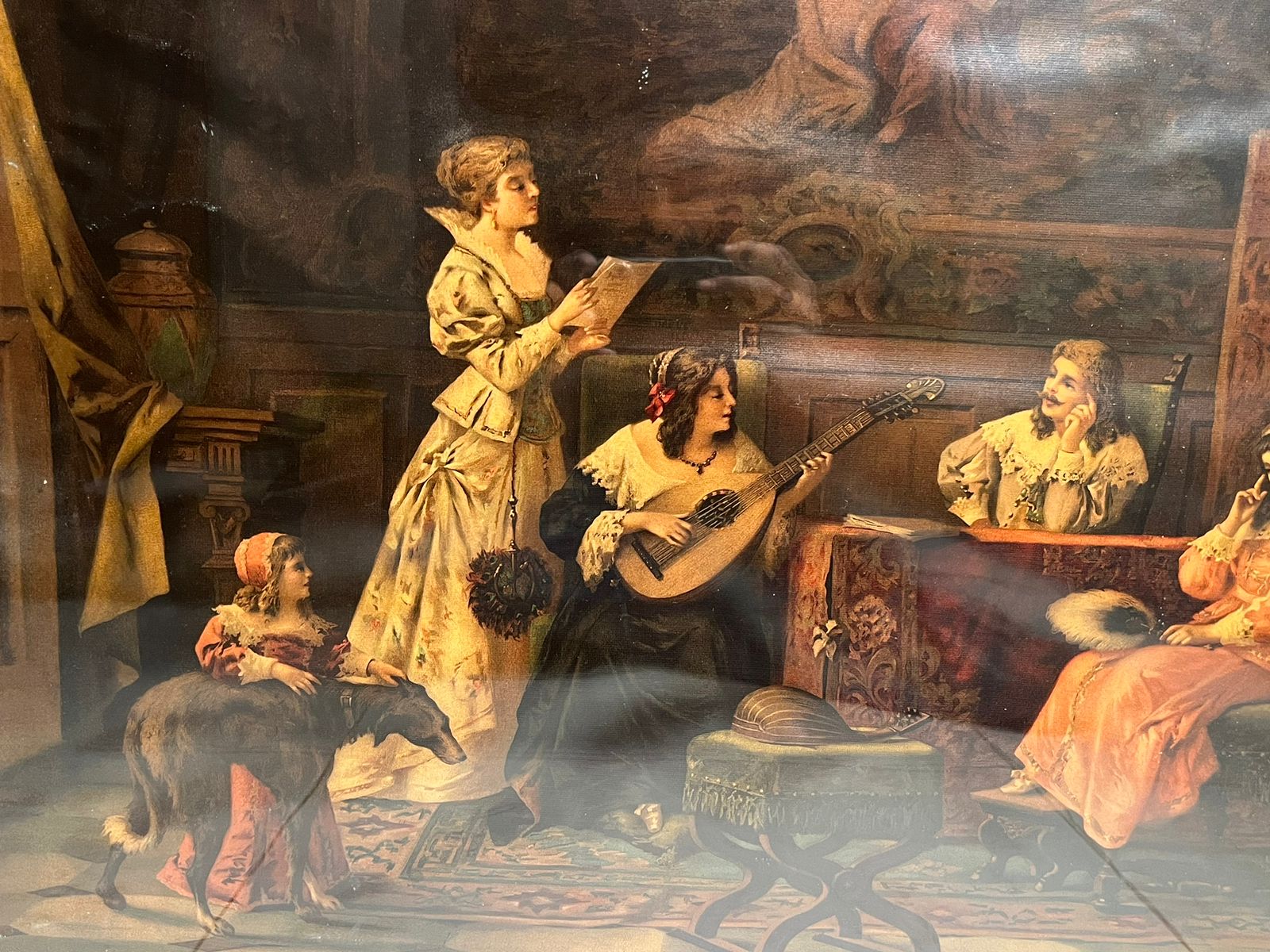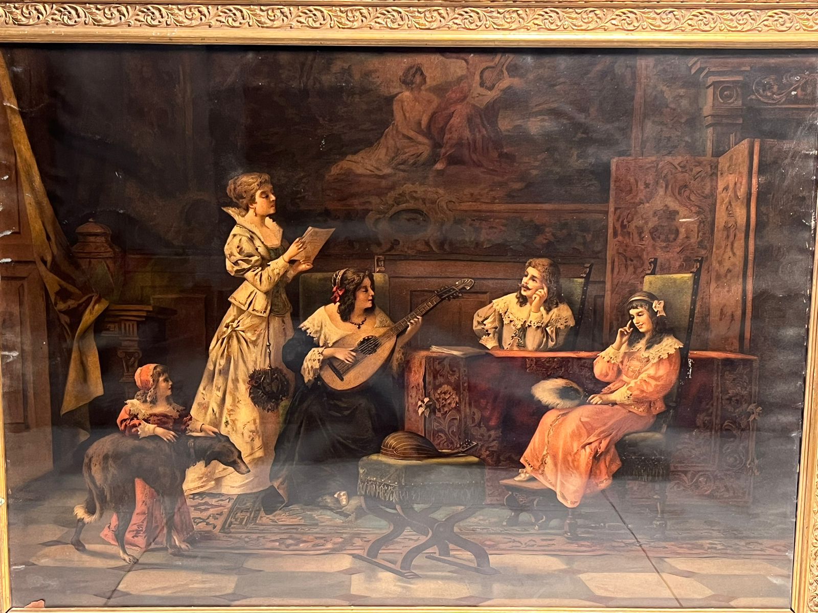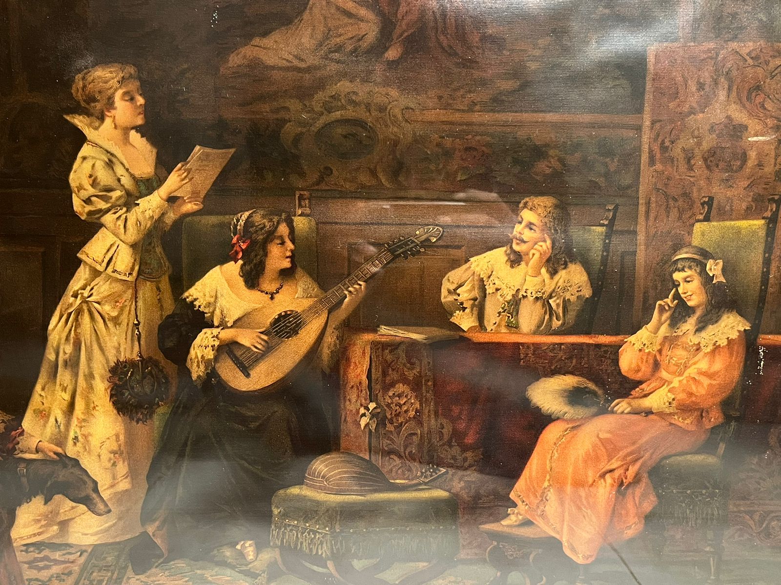 The artwork depicts a musical gathering scene, showcasing elegant figures in a classic vintage interior setting. Such prints were highly popular in the late 19th century and were considered luxury decorative pieces in elite homes.