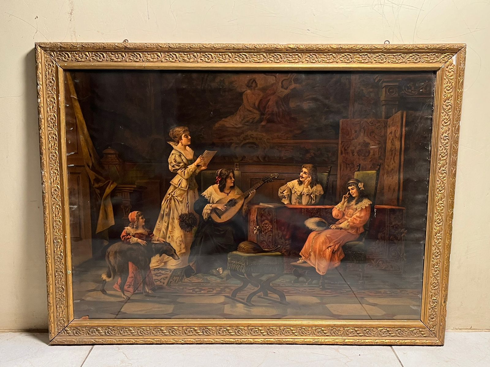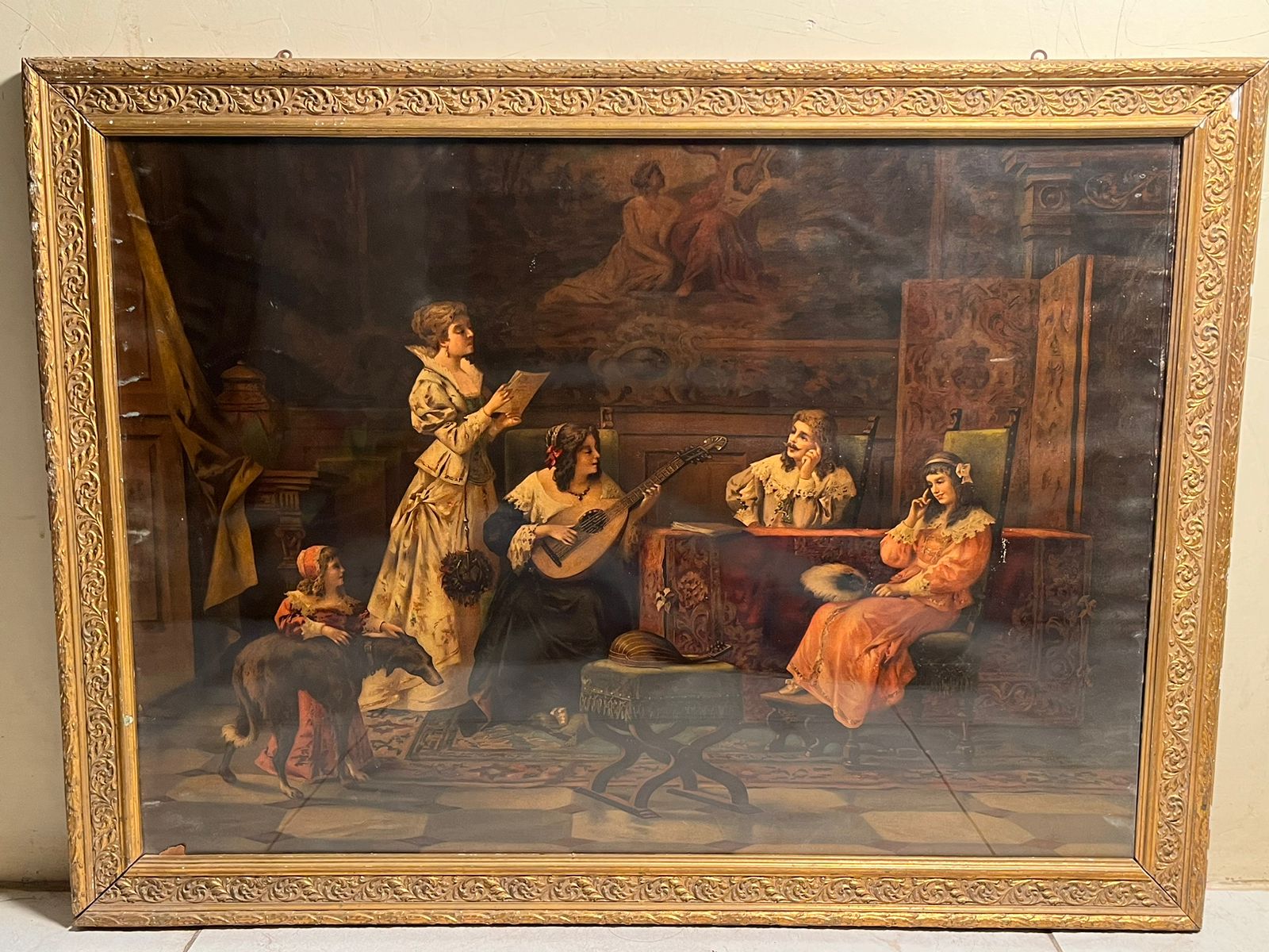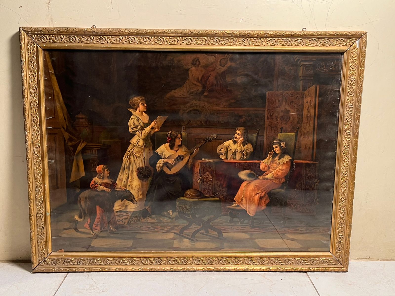 The artwork depicts a musical gathering scene, showcasing elegant figures in a classic vintage interior setting. Such prints were highly popular in the late 19th century and were considered luxury decorative pieces in elite homes.