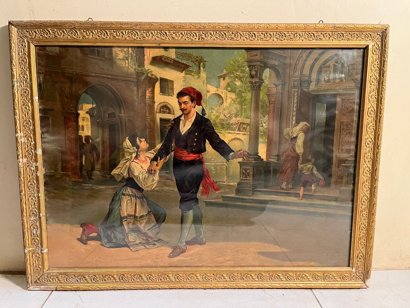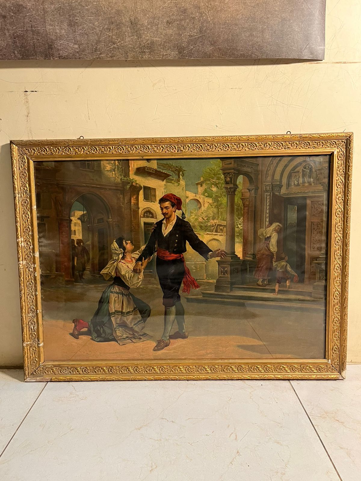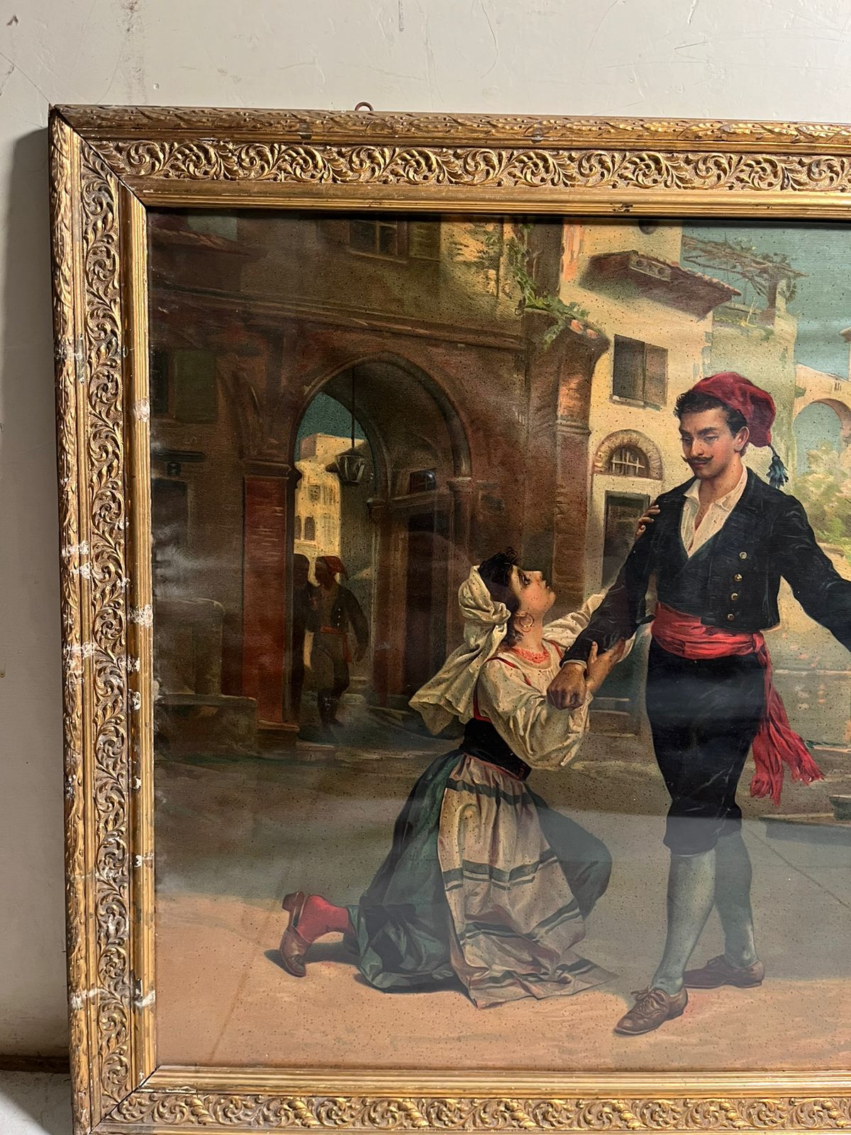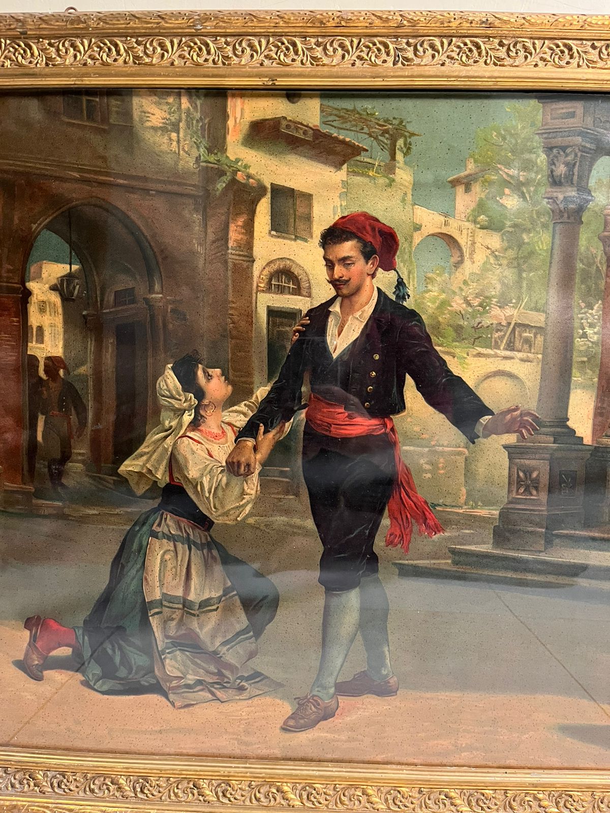 The artwork captures a romantic storytelling scene, where a traditionally dressed man and woman are engaged in an emotional moment in a classic European street setting. The architectural background, costumes, and expressions reflect the fine European artistic style of the late 19th century.