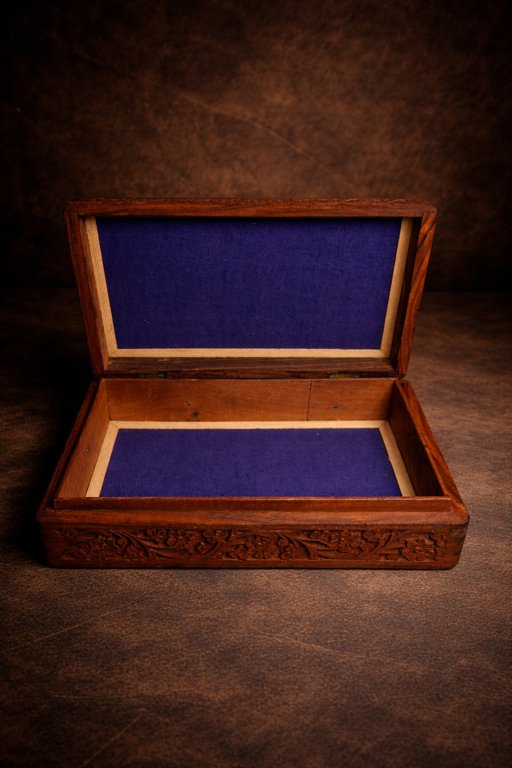 The exterior is richly carved with fine floral and vine motifs, giving it a royal and heritage look. Inside, the box is lined with soft velvet fabric, making it ideal for safely storing jewellery like bangles, kadas, or other valuables.