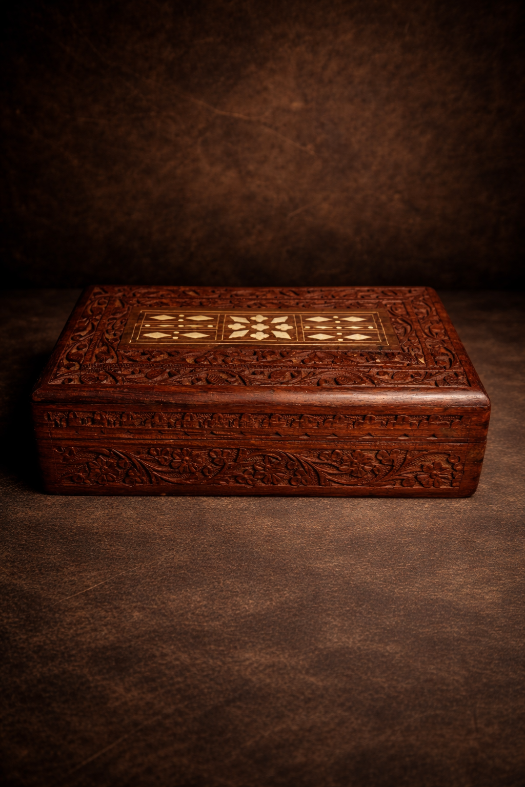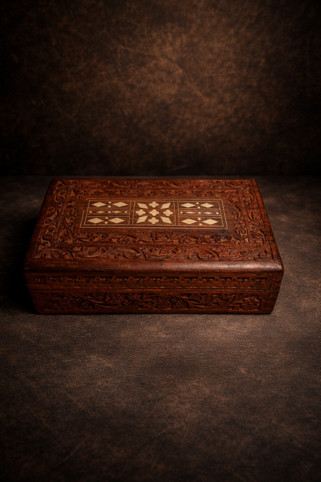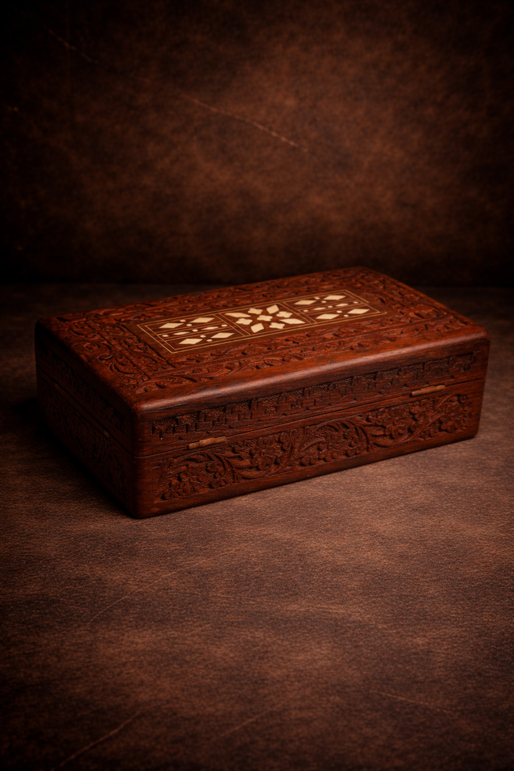 The top features intricate inlay work (bone/brass style design), forming a classic geometric and floral pattern — a hallmark of traditional Indian craftsmanship.