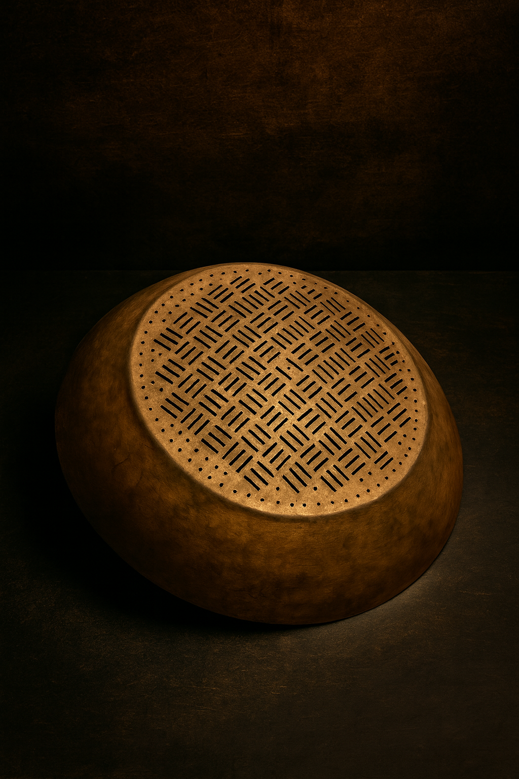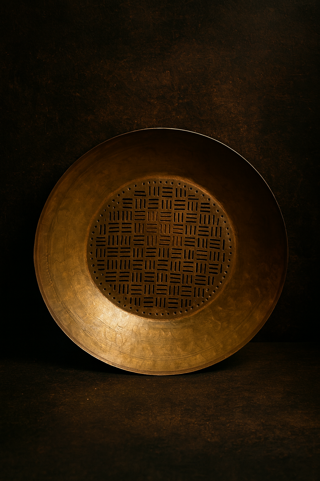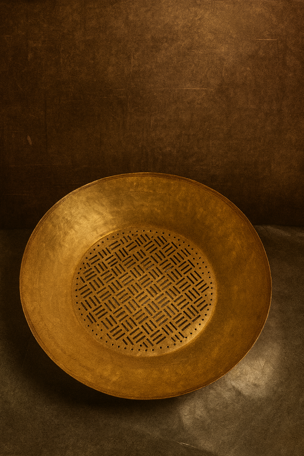 A beautifully hand-hammered antique brass strainer featuring intricate pierced latticework. Once used in traditional Indian kitchens for grain cleaning, this rare piece now serves as a timeless heritage collectible & luxury décor accent.