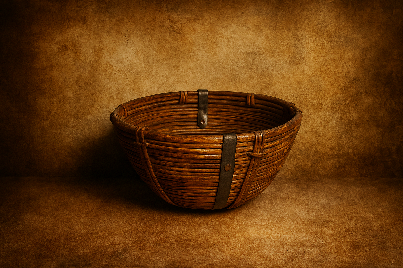 Bring home a piece of rustic Indian heritage with this 100+ years old hand-woven wooden basket, traditionally crafted using tightly coiled wooden vines and strengthened with iron straps.