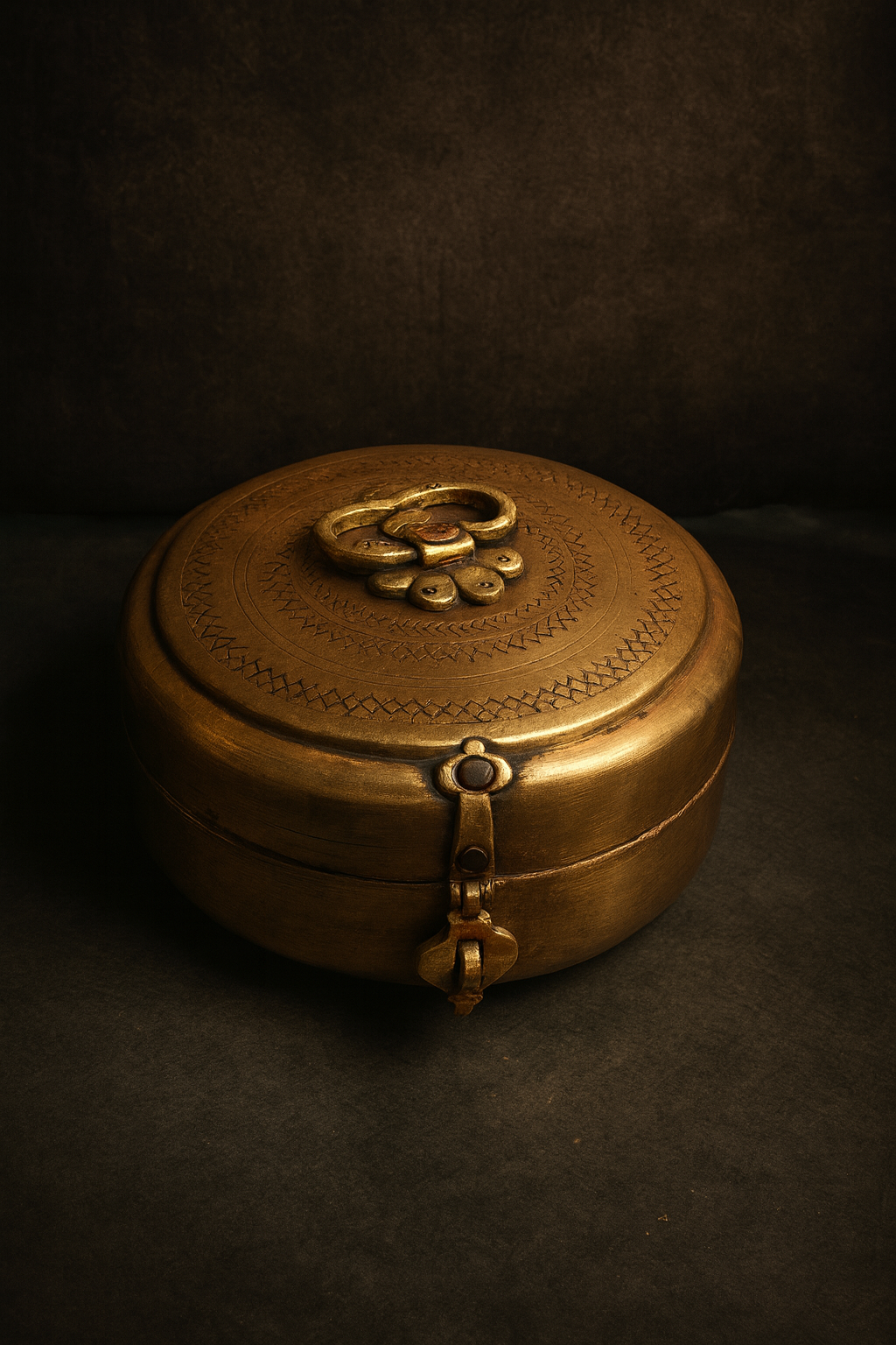 Crafted entirely by hand, this round box is adorned with traditional carvings on the lid and secured with a beautifully shaped brass latch.