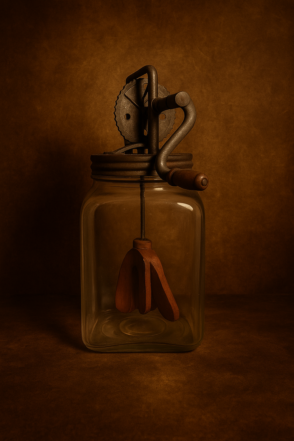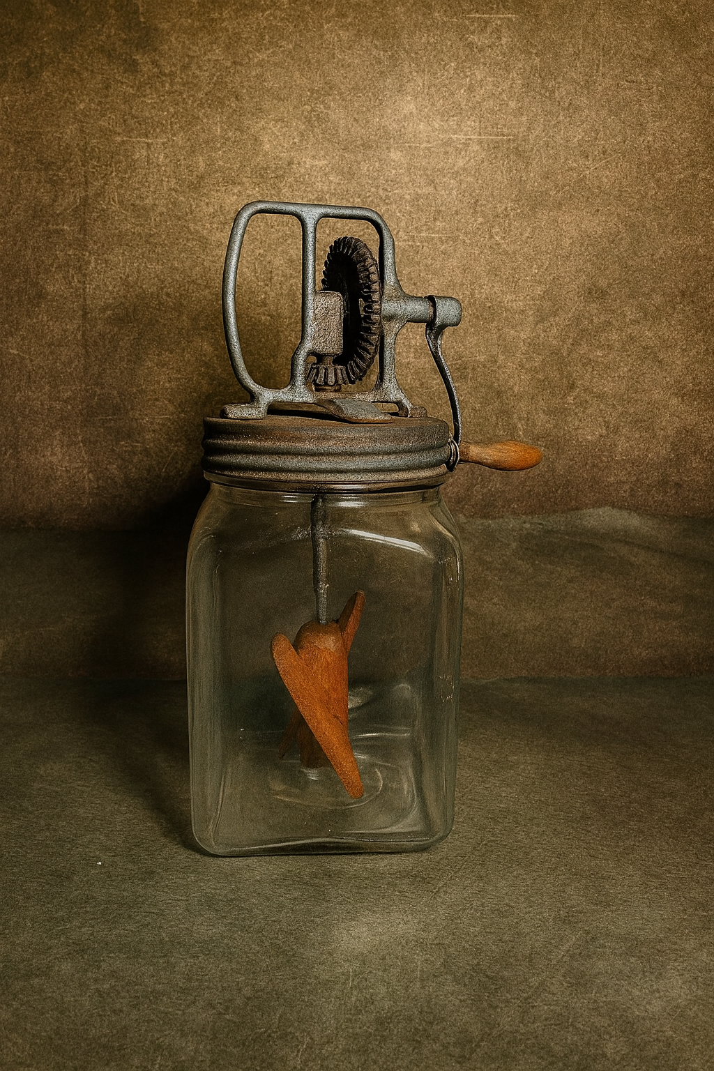 Material: Clear glass jar, cast iron crank, and wooden paddle