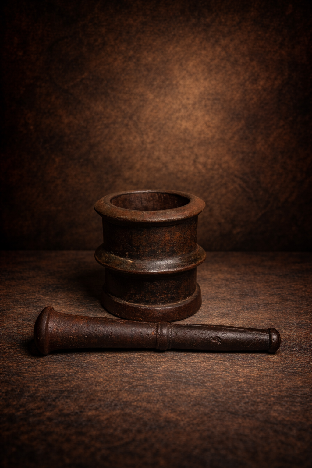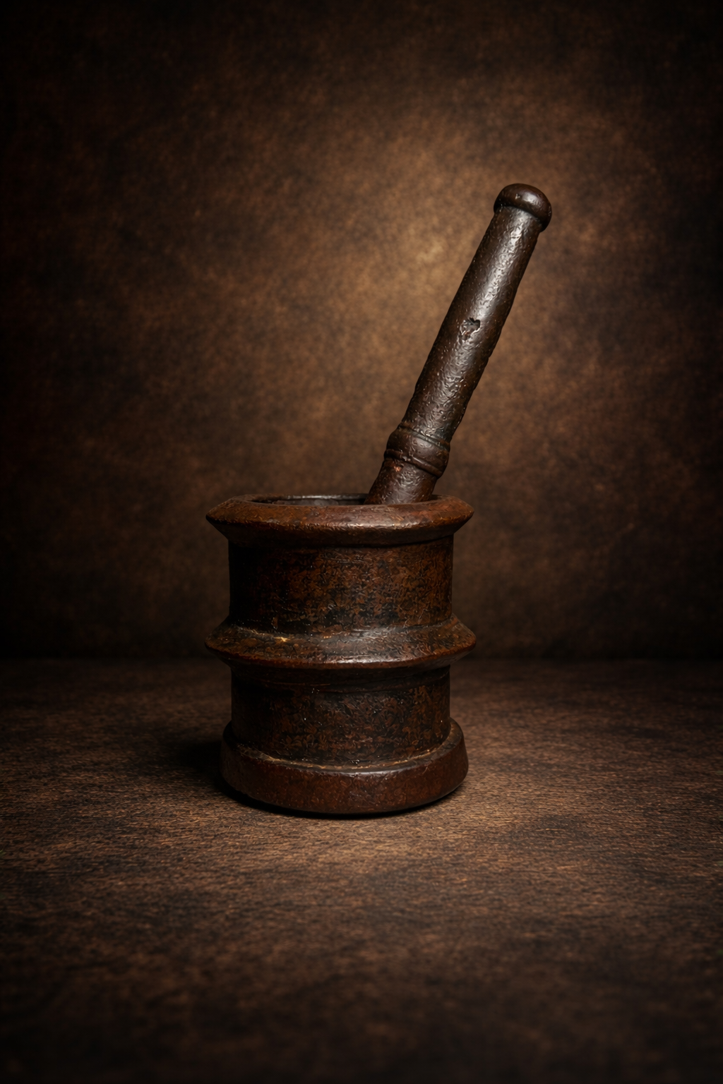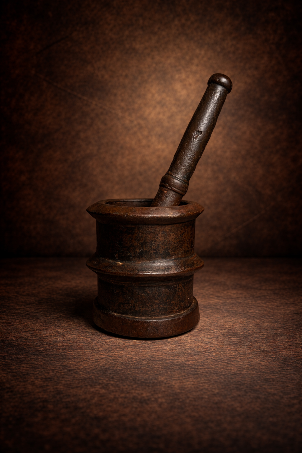 A solid iron mortar and pestle traditionally used for grinding spices, herbs, seeds, and other ingredients in a domestic kitchen. Crafted in robust cast iron with a simple functional form, it reflects enduring utilitarian design and metalwork. As a collectible, it represents classic food-preparation technology and heritage kitchenware valued by enthusiasts of metal tools.