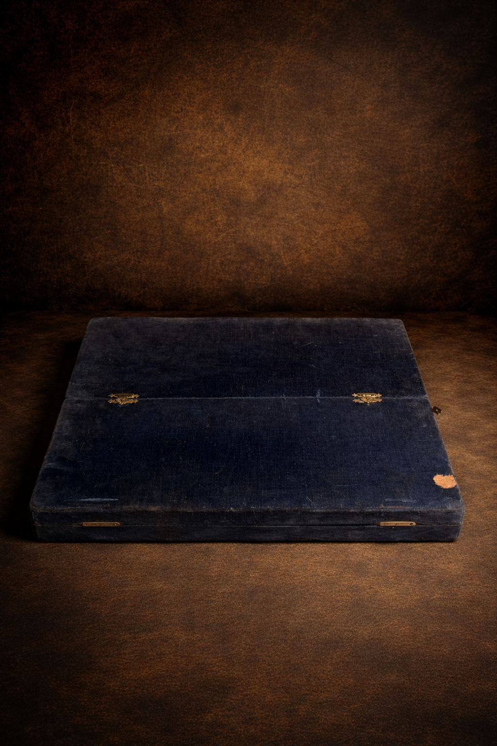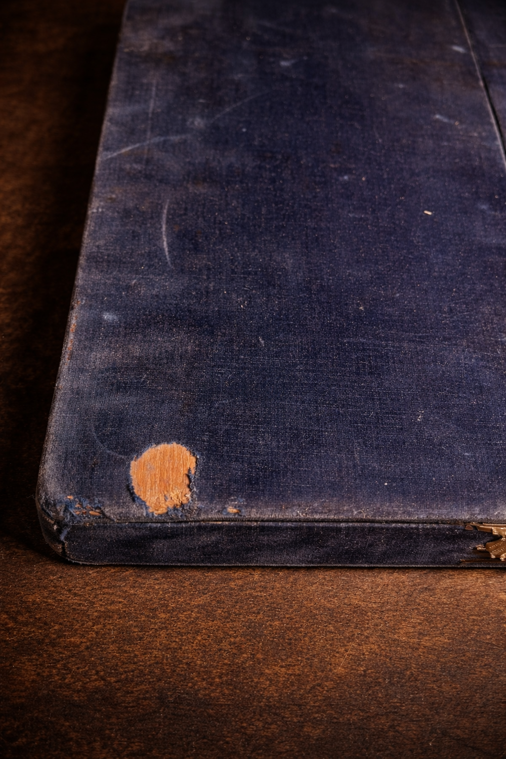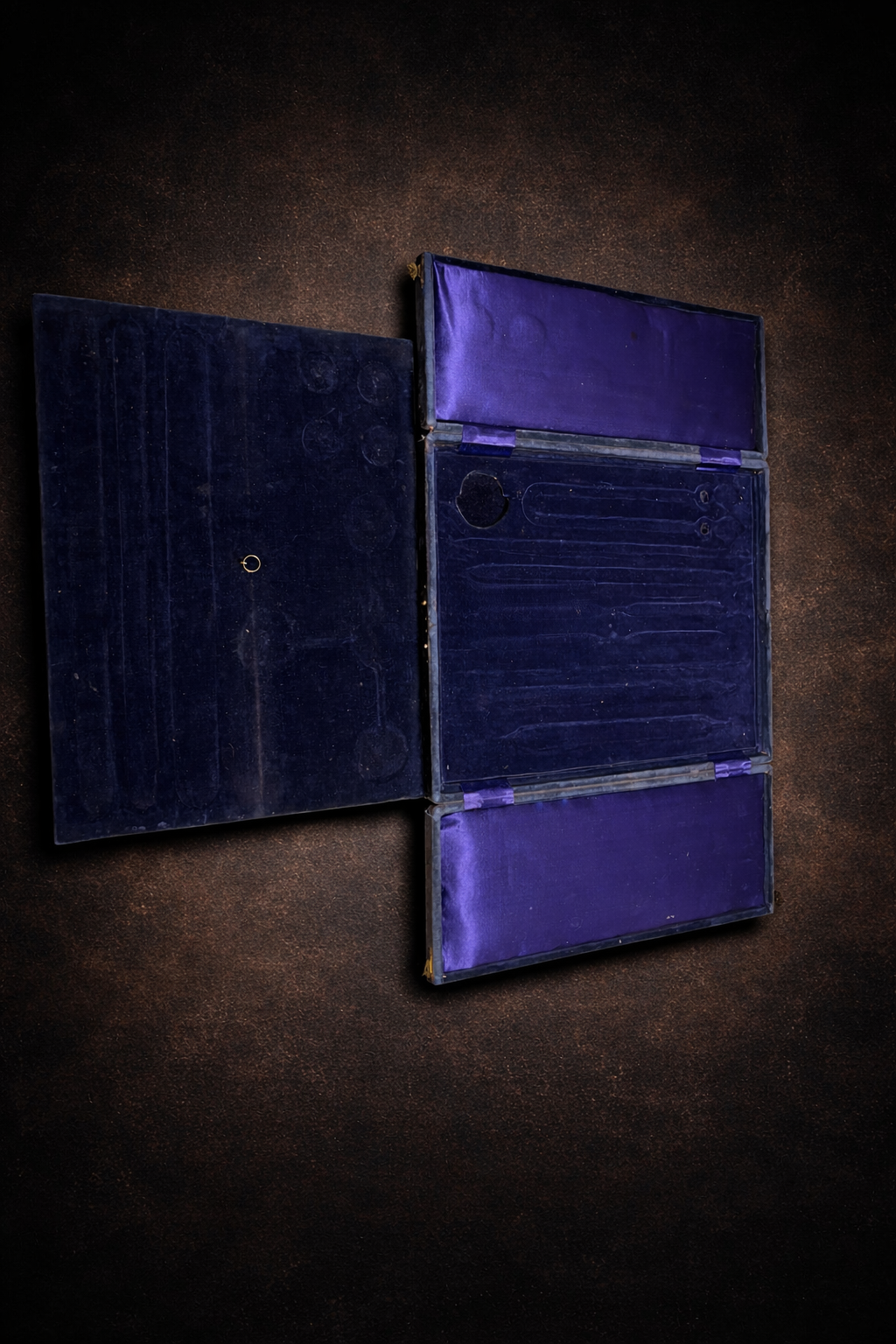 A rare and elegant antique jewellery storage box, crafted with a rich navy blue velvet exterior and luxurious royal purple satin interior. This unique folding case features a secure 6-lock mechanism, making it both functional and collectible.