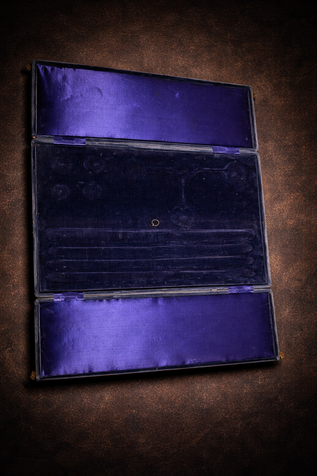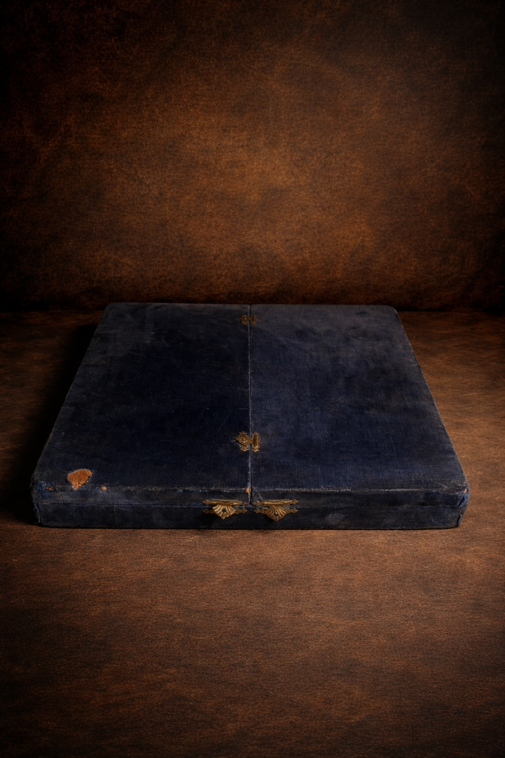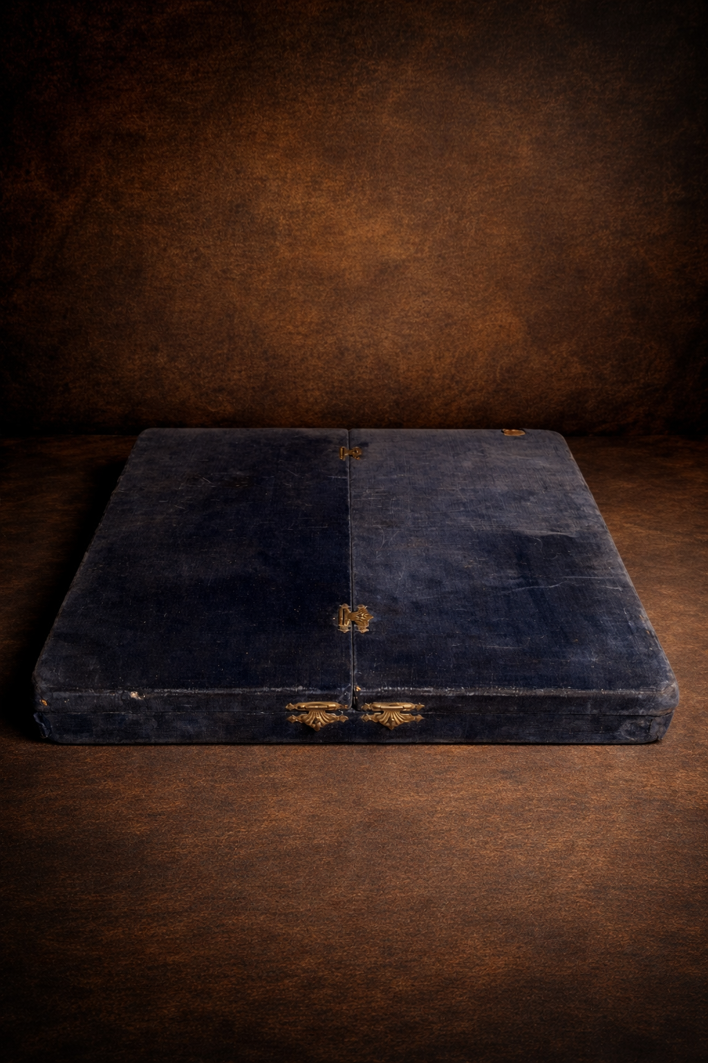 A rare and elegant antique jewellery storage box, crafted with a rich navy blue velvet exterior and luxurious royal purple satin interior. This unique folding case features a secure 6-lock mechanism, making it both functional and collectible.