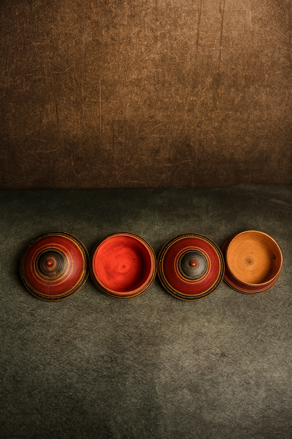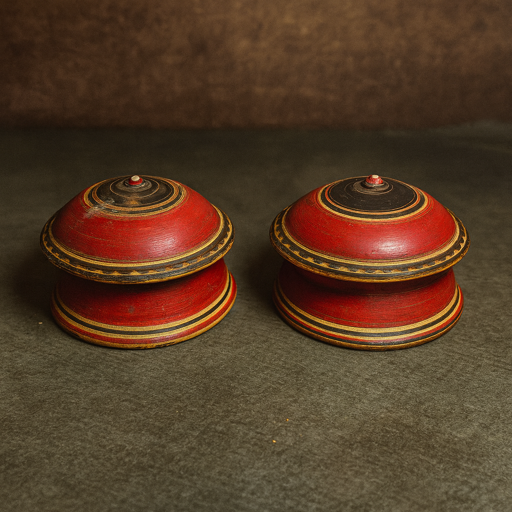 Add a touch of heritage to your collection with these antique wooden hand-painted vegetable color boxes, traditionally used for storing natural pigments. Made with fine craftsmanship, each box is turned from solid wood and finished with striking red, black, and gold vegetable-based colors, reflecting the artistry of Indian folk traditions.