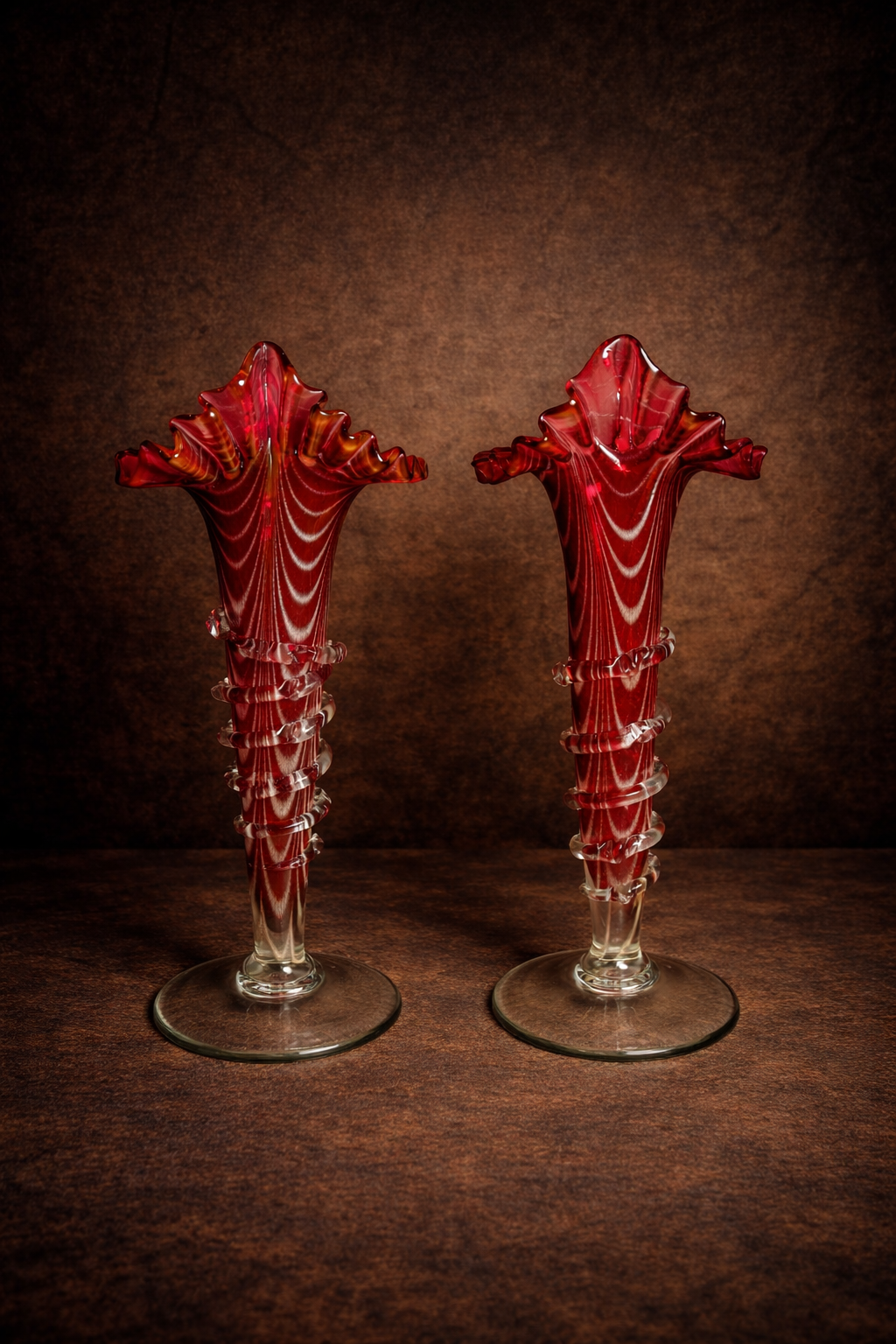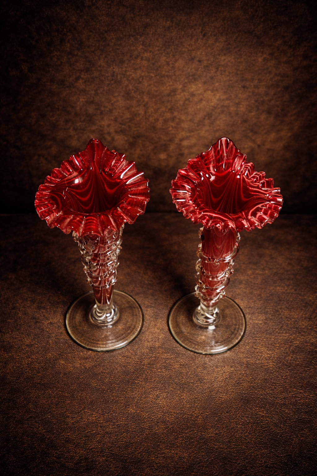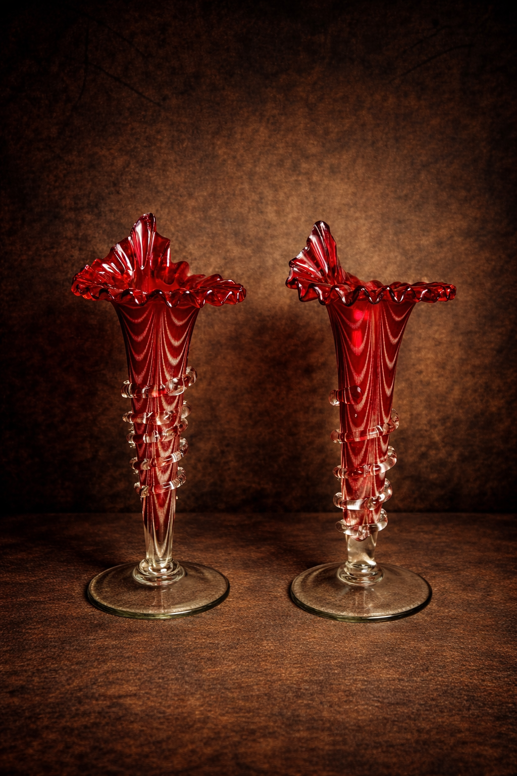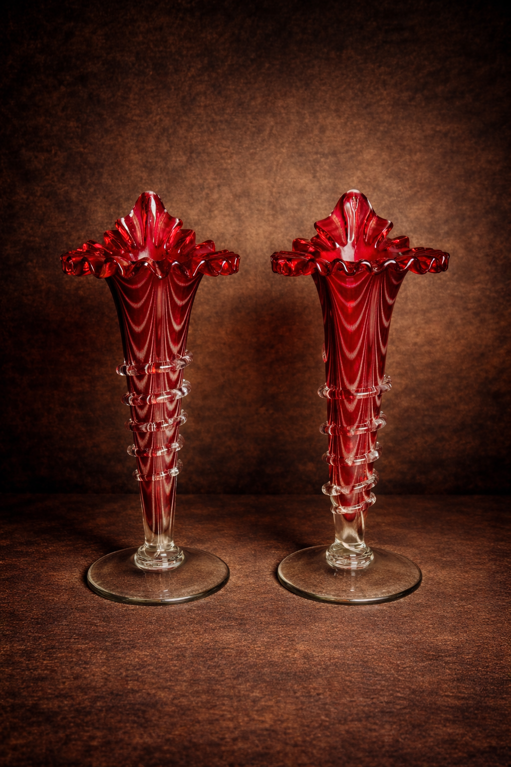 A striking pair of hand-blown art glass vases, crafted in a beautiful ruby red tone with clear glass accents. These vases feature an elegant fluted trumpet design, enhanced by delicate spiral glass detailing that wraps gracefully around the body.