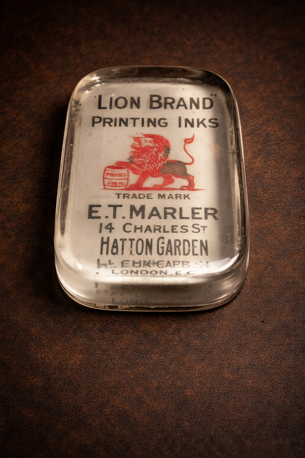 A unique and highly collectible vintage glass piece featuring the iconic “Lion Brand Printing Inks” advertisement by E.T. Marler, based in Hatton Garden, London.