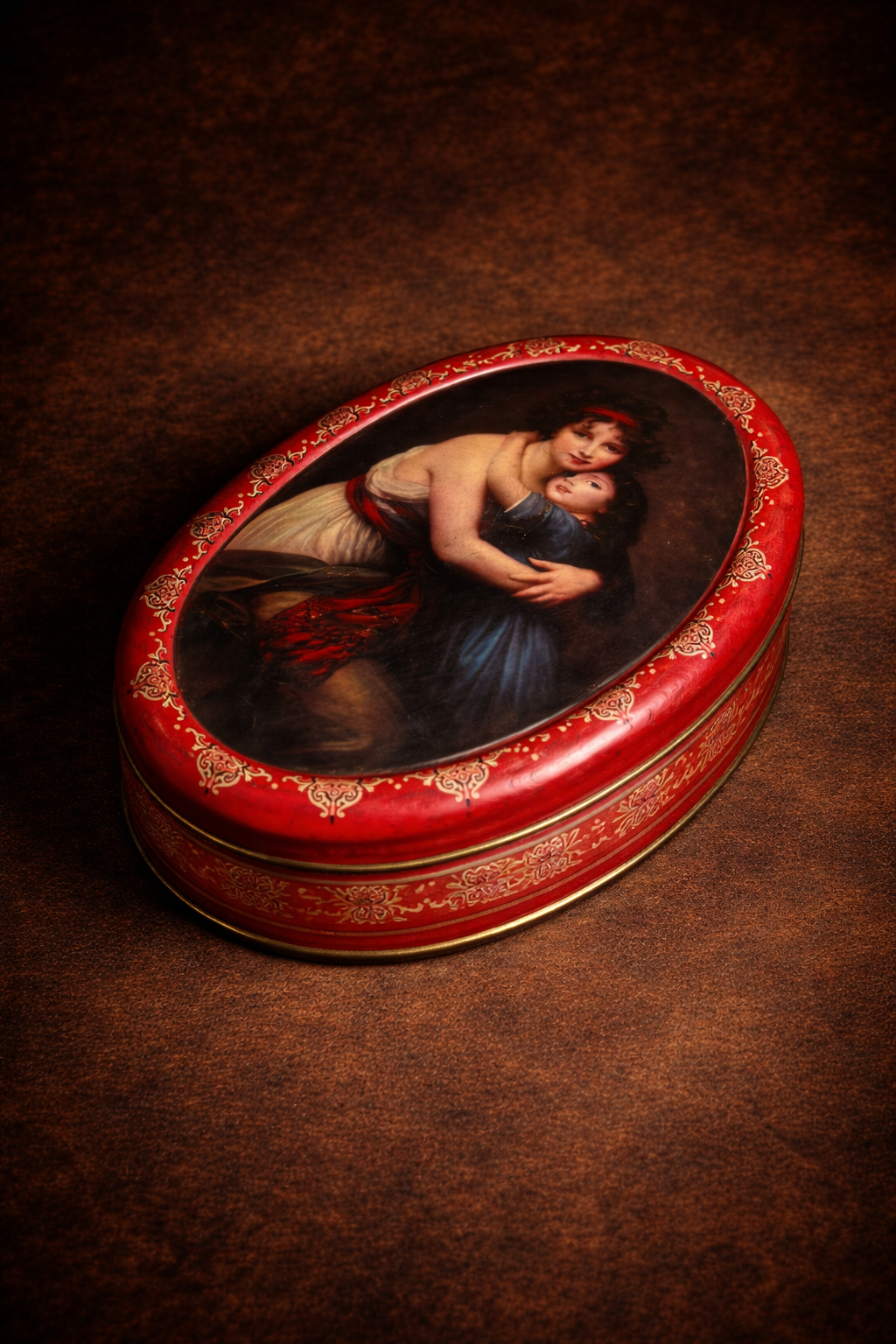 The elegant oval shape, deep red border with intricate golden detailing, and the emotional embrace captured in the artwork make this piece truly timeless. The soft expressions and fine artistry reflect warmth, love, and vintage sophistication.