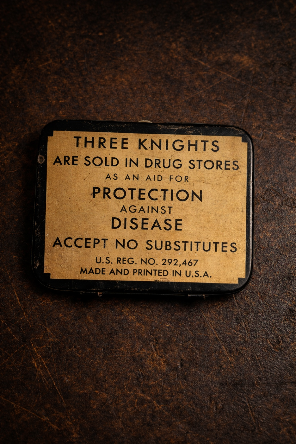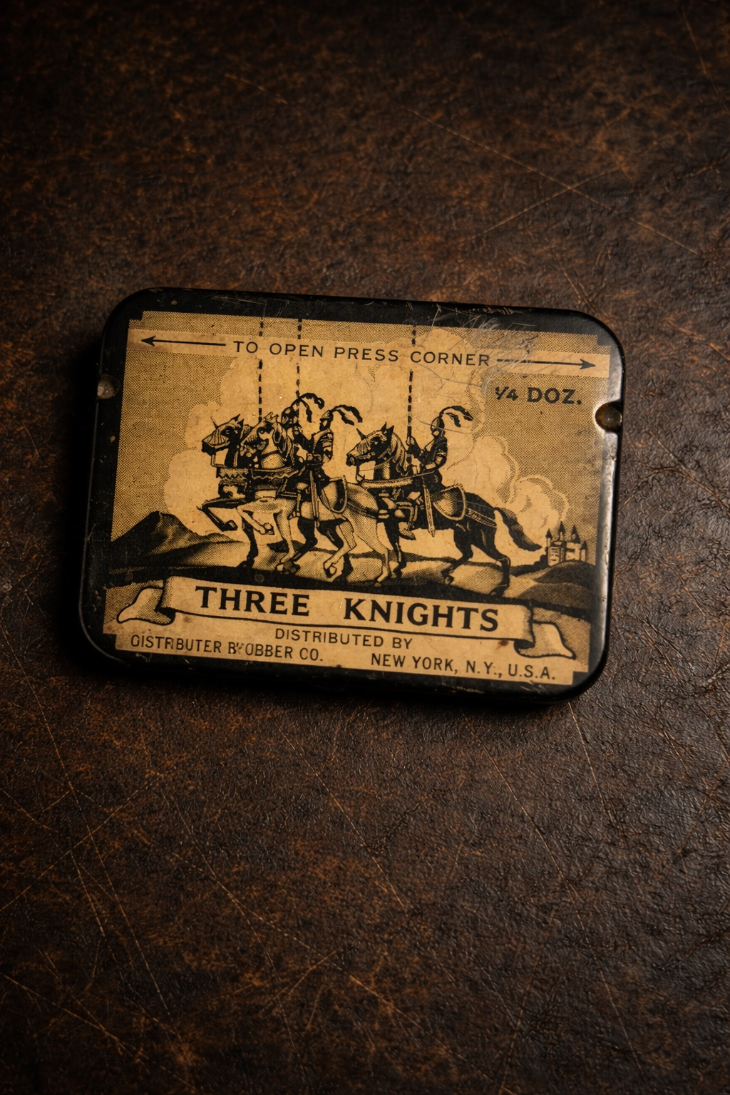 A vintage advertising tin for “Three Knights” prophylactics, originally produced in the United States by the Goodwear Rubber Company. This lithographed tin served as a container for early branded prophylactic products and exemplifies mid-20th-century commercial packaging and promotional design. As a collectible, it appeals to enthusiasts of advertising memorabilia and social-history artifacts.
