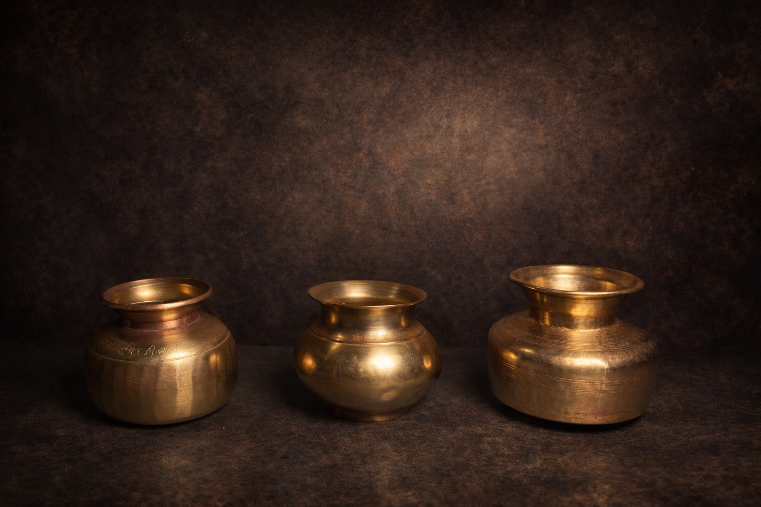 Made from pure solid brass, these pots carry a natural aged patina, giving them a rich golden tone that reflects their vintage authenticity. Compact yet heavy for their size, they are ideal for pooja rituals, kalash placement, water offerings, or devotional décor.
