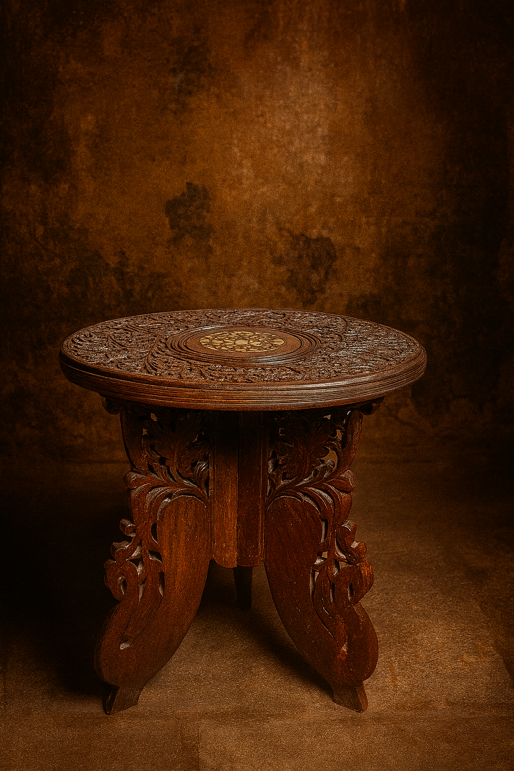 This breathtaking antique teak wood table is a masterpiece of old Indian craftsmanship. Completely carved by hand, the tabletop features deep floral and leaf patterns, beautifully arranged around a central inlay medallion made using traditional techniques. The base is equally impressive, with intricate cut-work legs that showcase rare artisan skill.