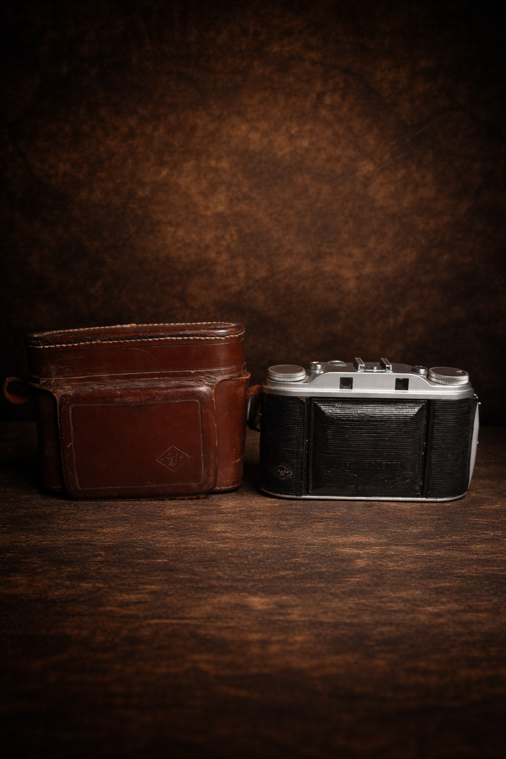 Original vintage condition with visible signs of age and wear. Bellows intact but aged. Metal body shows patina and minor rust spots. Leather case original with wear and stitching aging. Camera untested – sold as collectible/decor piece.