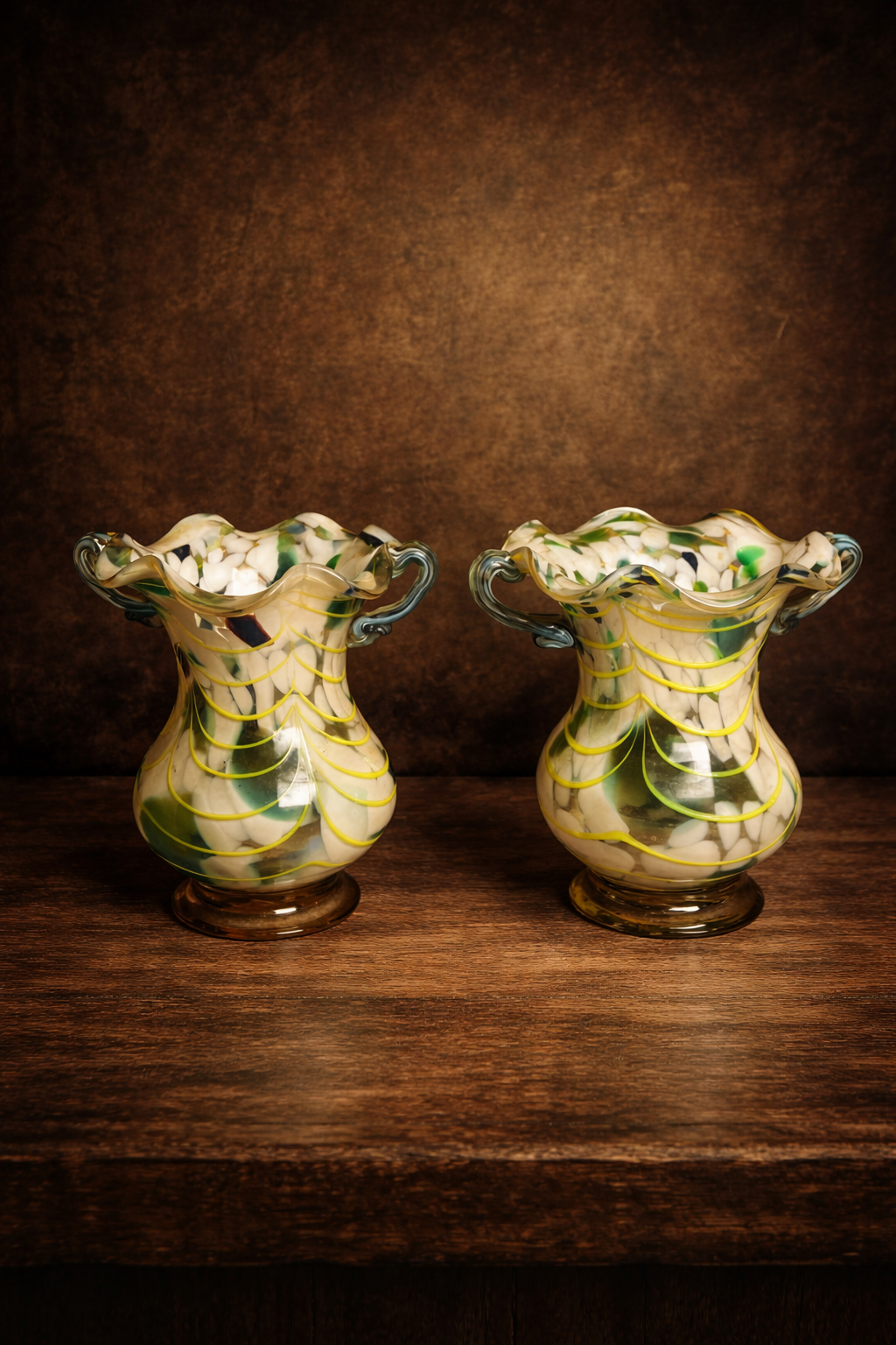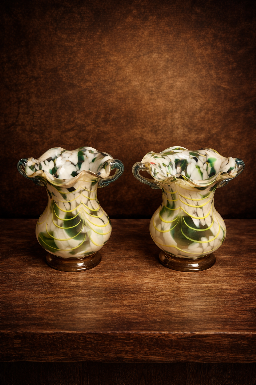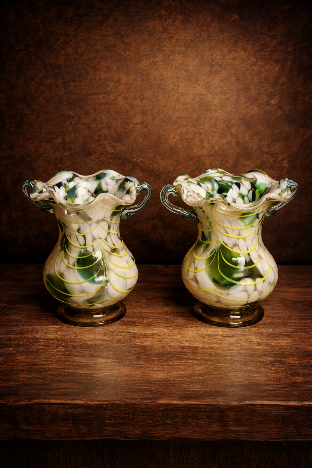 An exquisite pair of vintage art glass vases, beautifully crafted with a mesmerizing blend of white, green, and subtle earthy tones. These vases feature a distinctive hand-blown glass design with elegant flowing patterns and delicate overlay work, giving them a luxurious and timeless appeal.
