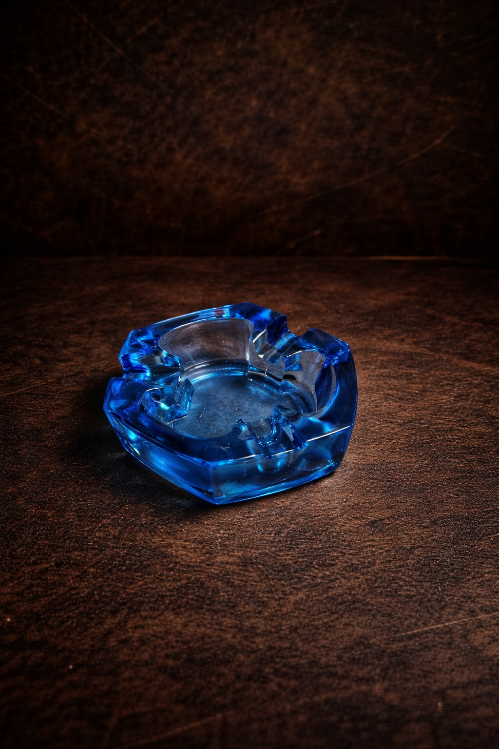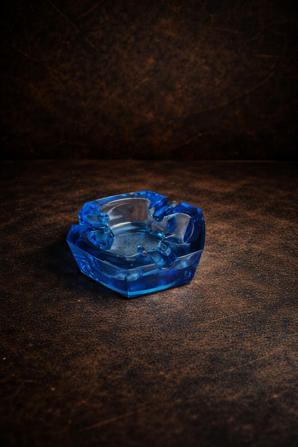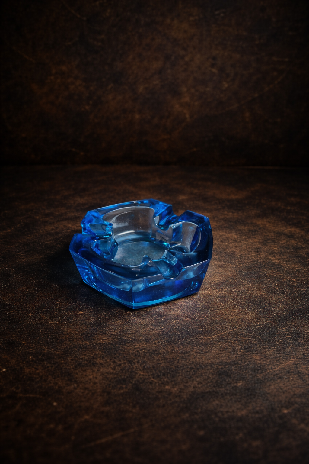 A beautiful vintage ashtray crafted in a rich deep blue pressed glass, featuring a bold and clean design. Unlike cut glass, this piece is molded in a solid form, giving it smooth curves and a thick, durable structure.