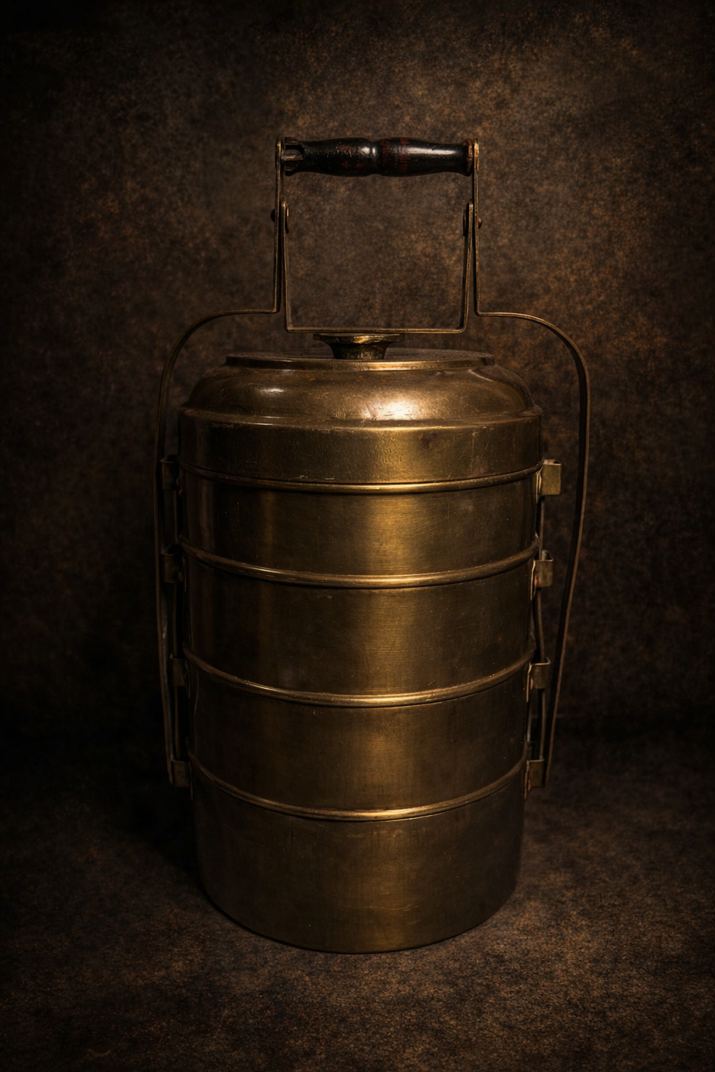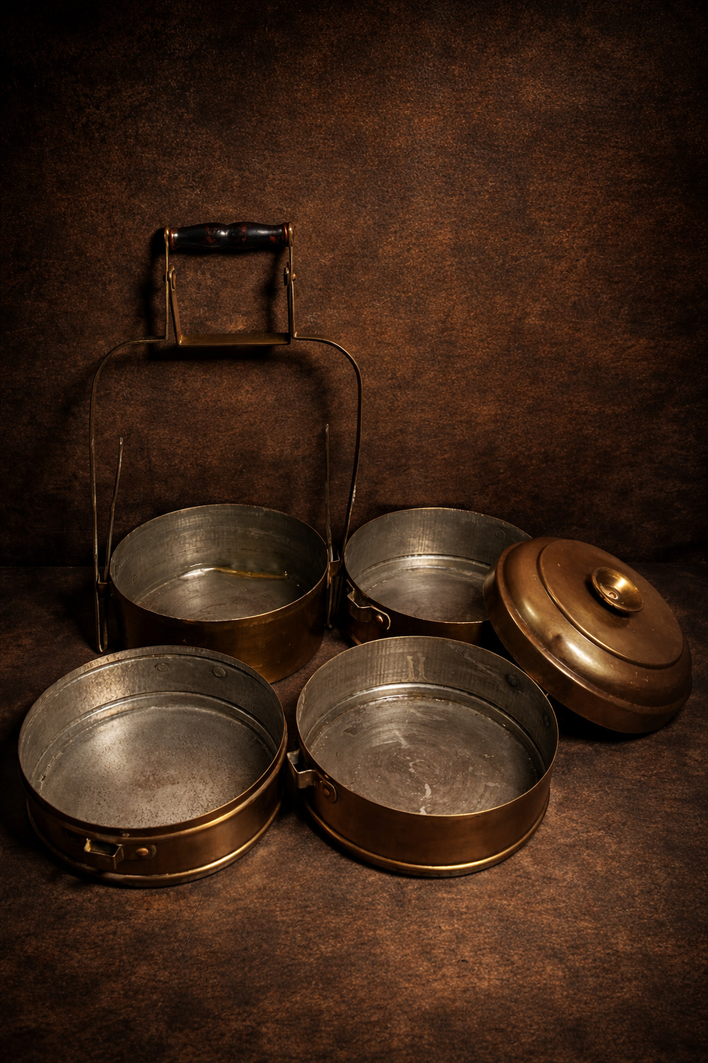 A traditional multi-compartment brass tiffin box comprising four stacked vessels designed for carrying and storing meals. A classic lunch carrier in brass, this item reflects practical daily utility in food transport and serving. As a collectible, it represents enduring metalwork and traditional lunchware form.