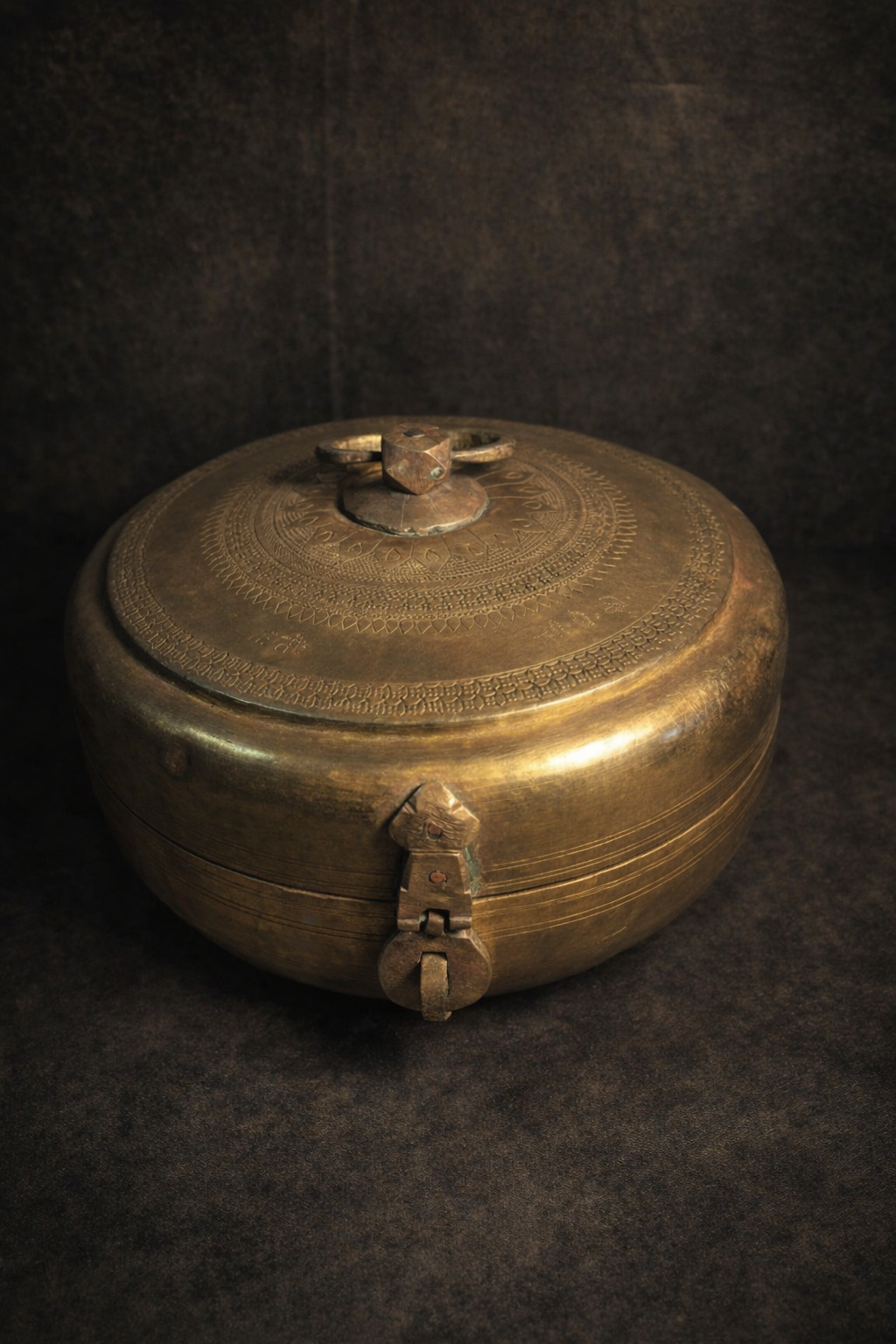 This rare 125+ years old antique brass Kadi Khunta box is a magnificent example of traditional Indian metal craftsmanship. Entirely hand-carved, the box features intricate geometric and floral motifs engraved with exceptional precision, reflecting the skilled artistry of its era.