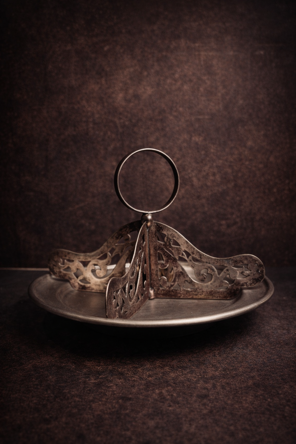 A traditional brass serving tray with multiple compartments and an integral handle, designed for organized presentation of food or small items. Crafted in solid brass with a functional divided layout, it reflects enduring utilitarian design and metalwork. In a collection, it represents classic serving ware valued for practical form and material quality.