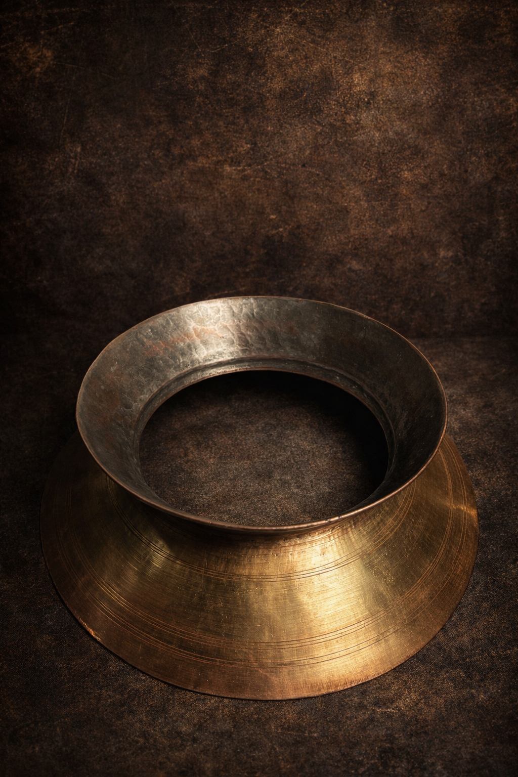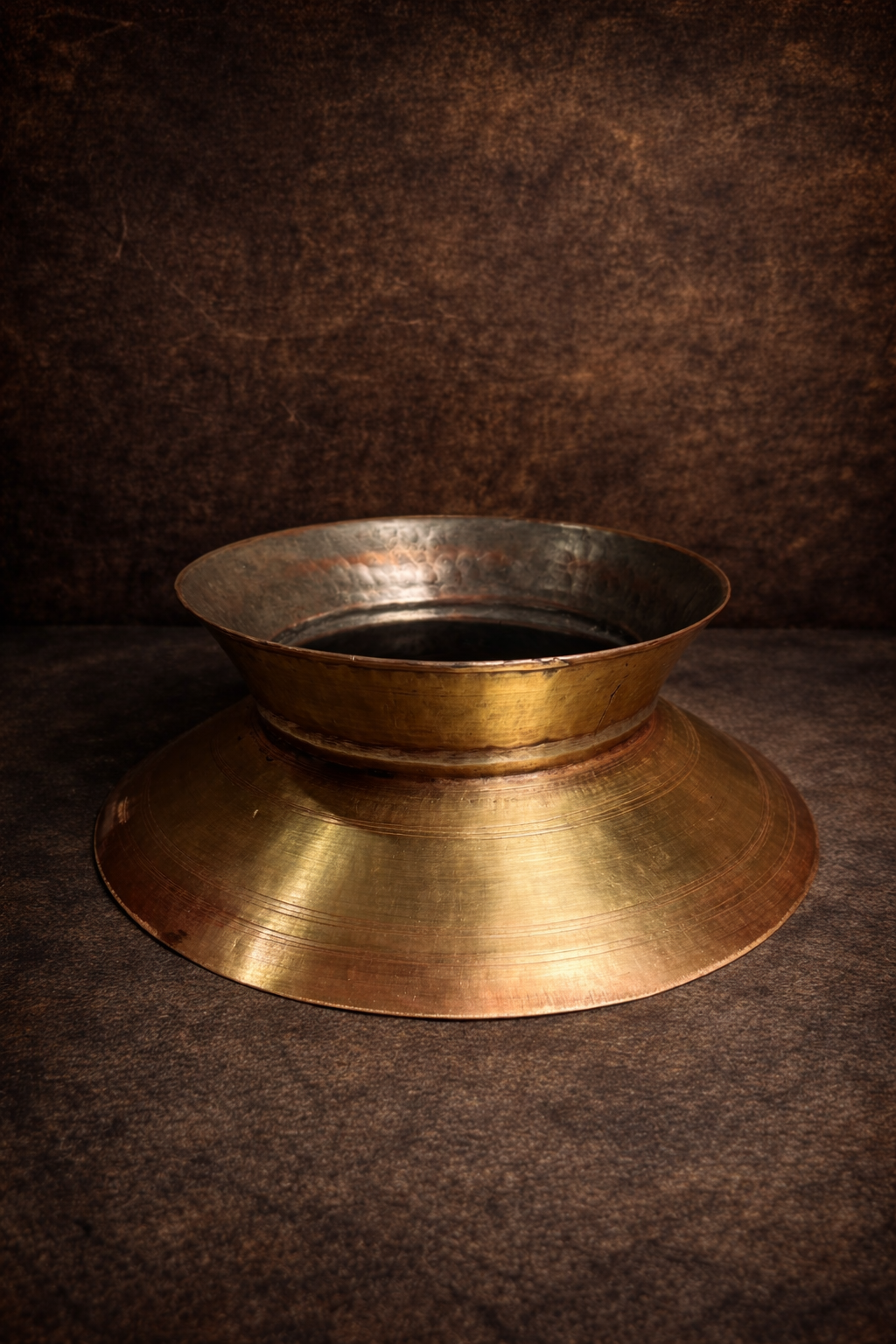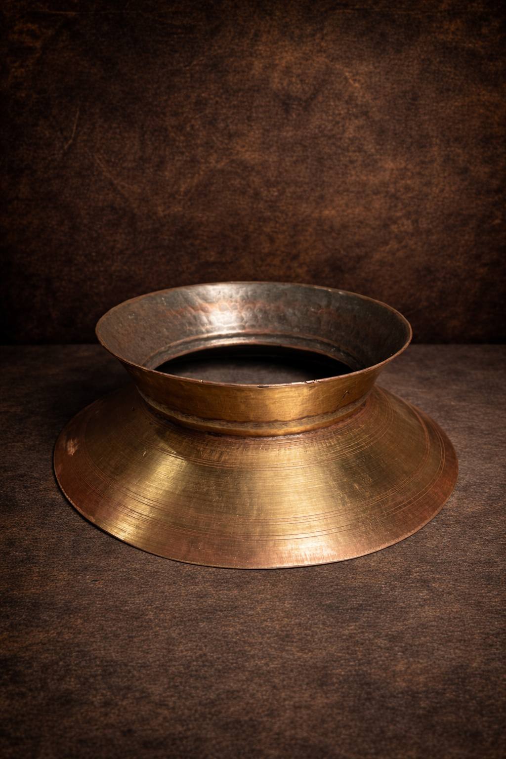 A traditional solid brass pot stand featuring a raised platform designed to support large vessels or containers. Crafted with utilitarian purpose in mind, it reflects enduring metalwork and practical form. As a collectible, it represents classic household support ware valued for material quality and traditional design.