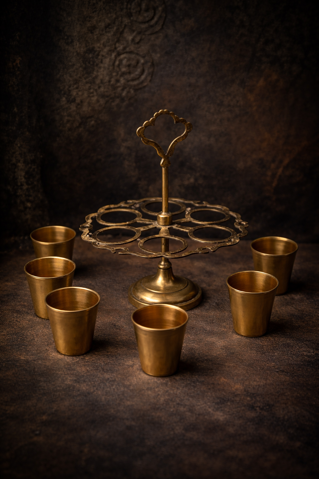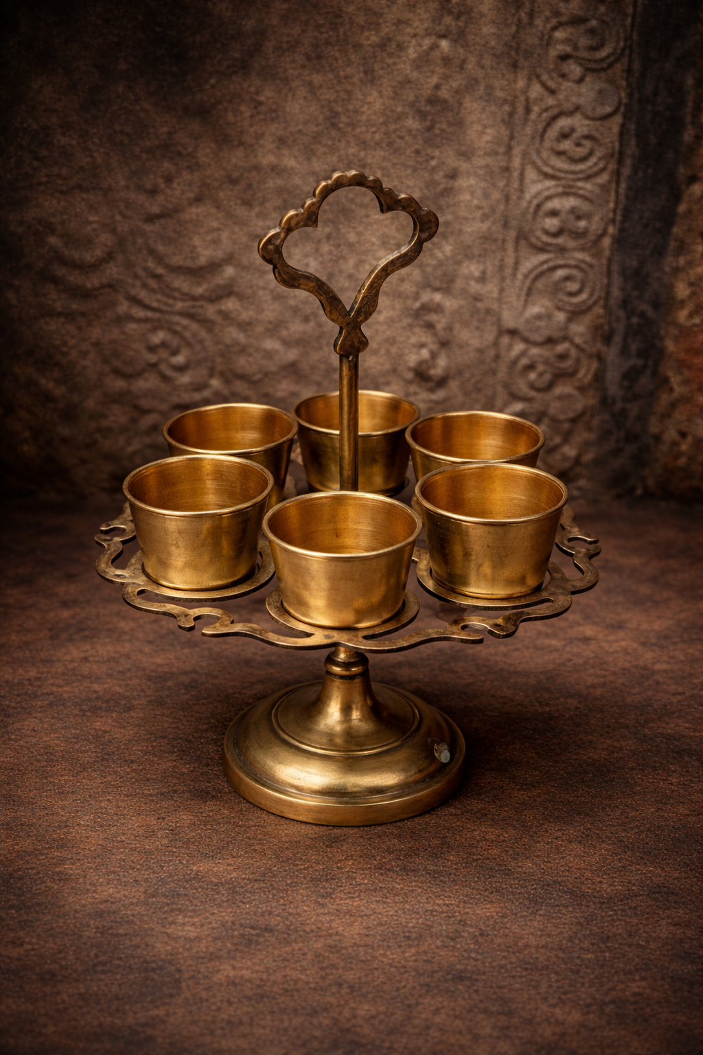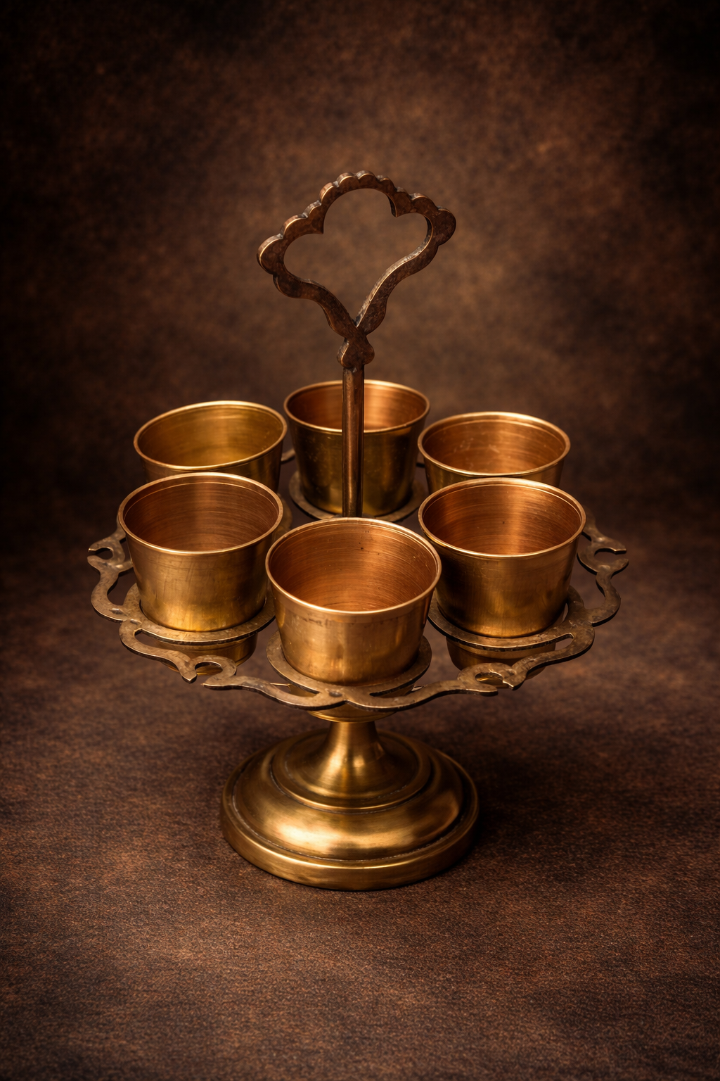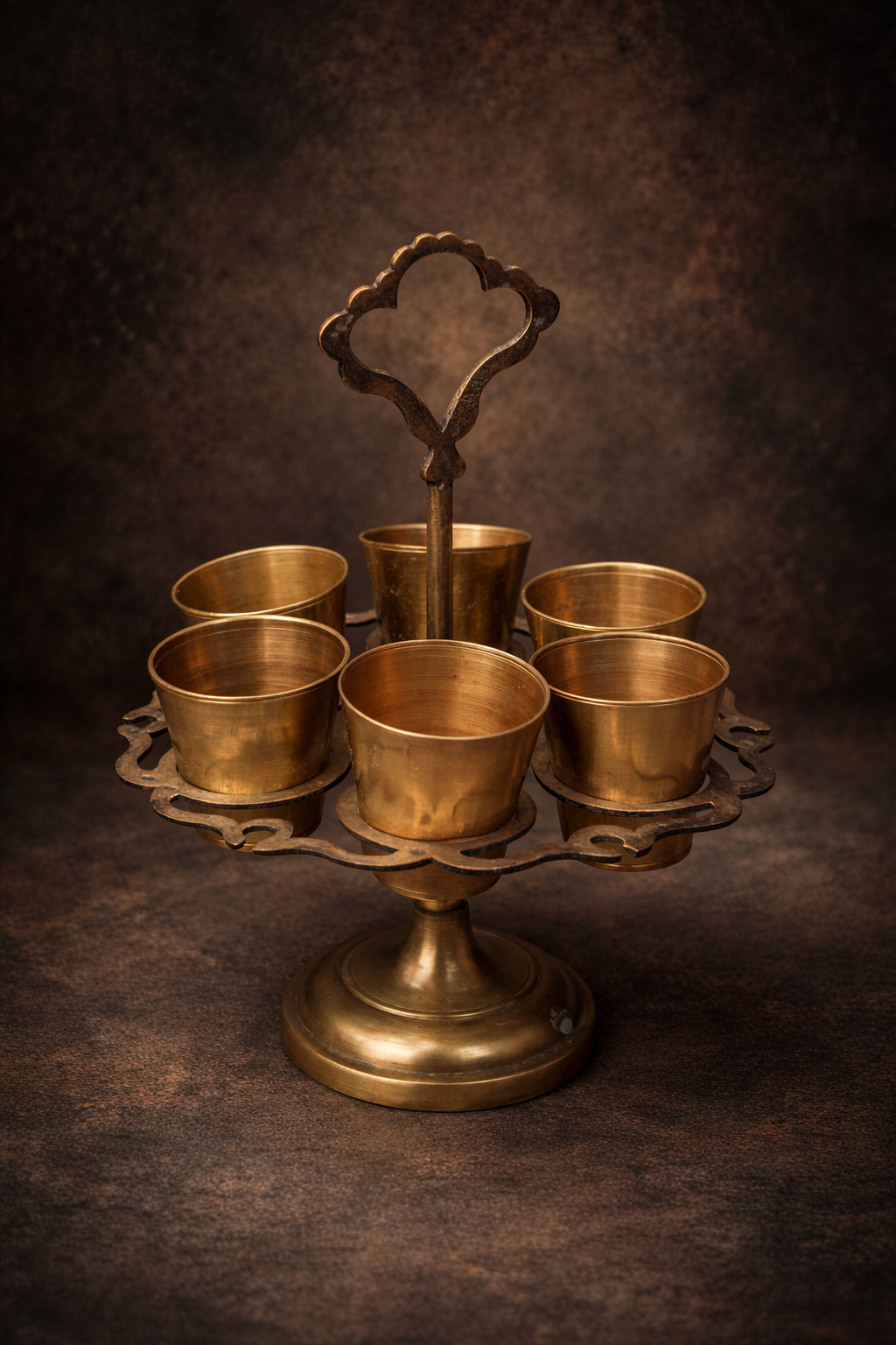 This unique vintage brass serving stand features six miniature cups arranged around a beautifully crafted central holder with an elegant handle. Designed for refined presentation, this piece reflects the charm of traditional Indian and colonial-era serving styles.