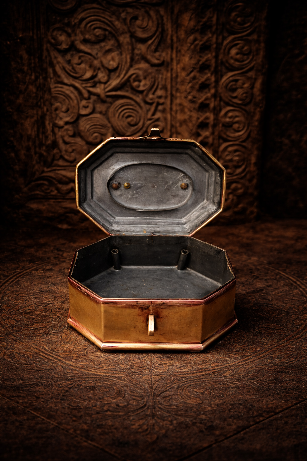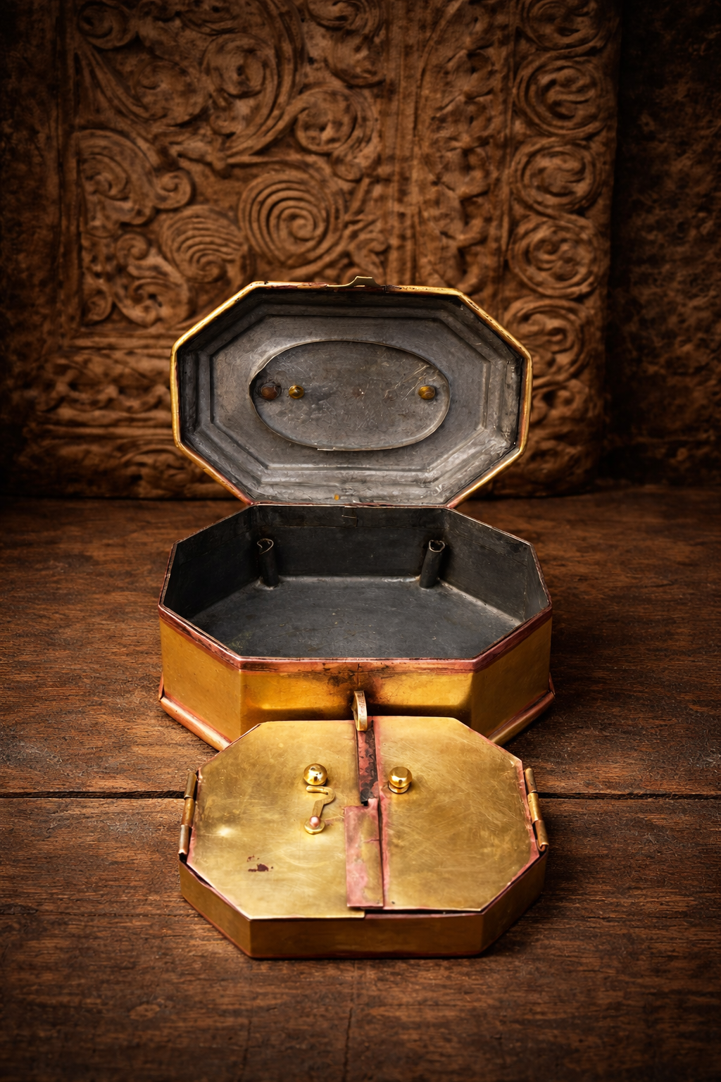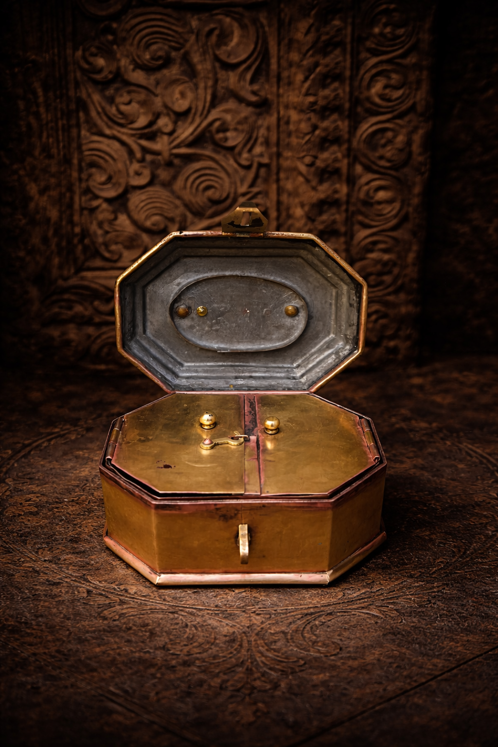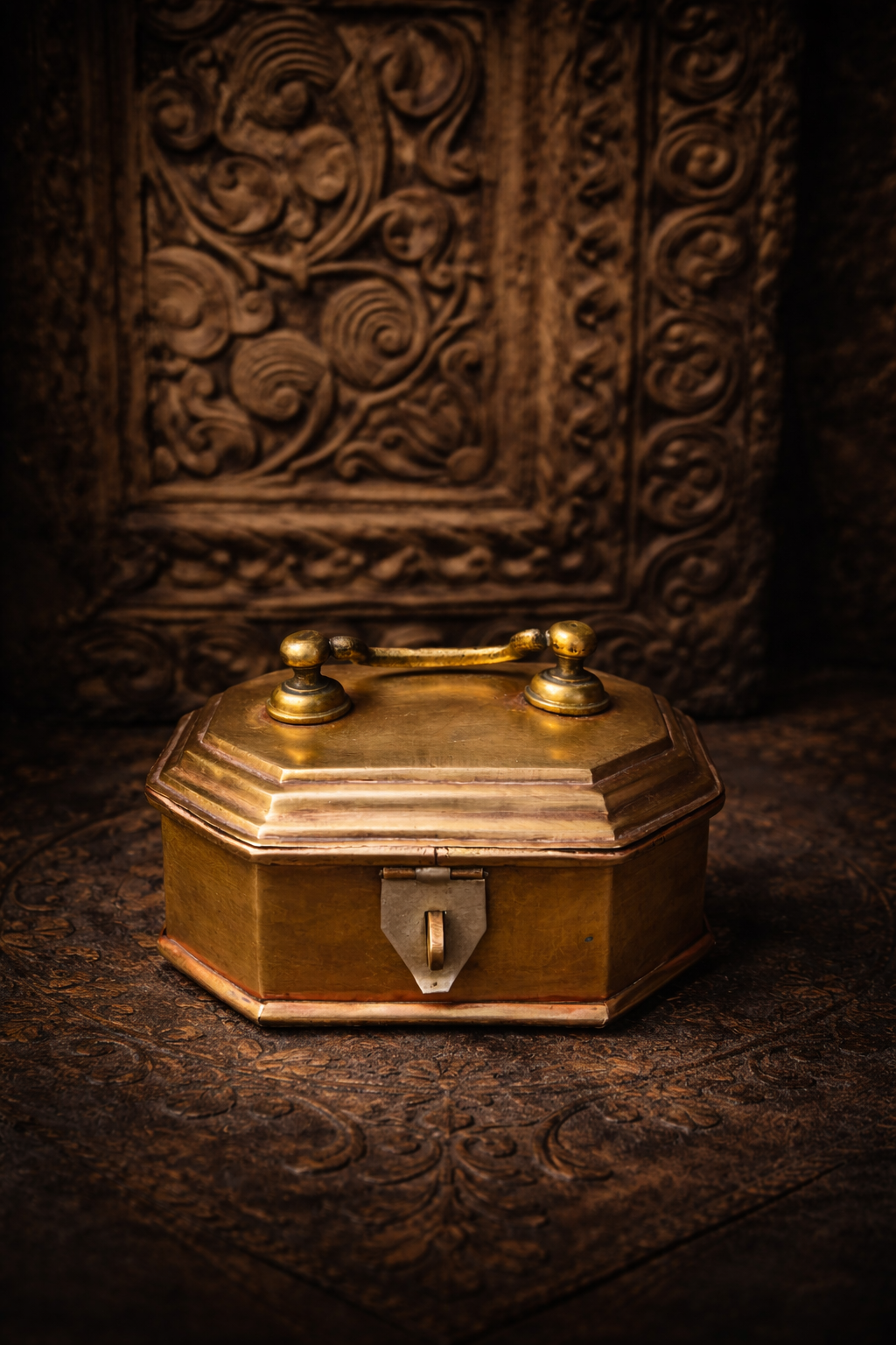 This authentic vintage brass paan daan is a beautiful representation of traditional Indian hospitality and craftsmanship. Designed in a classic octagonal form, it features a unique folding inner lid system with multiple compartments, originally used for storing betel essentials such as supari, chuna, kattha, and spices.