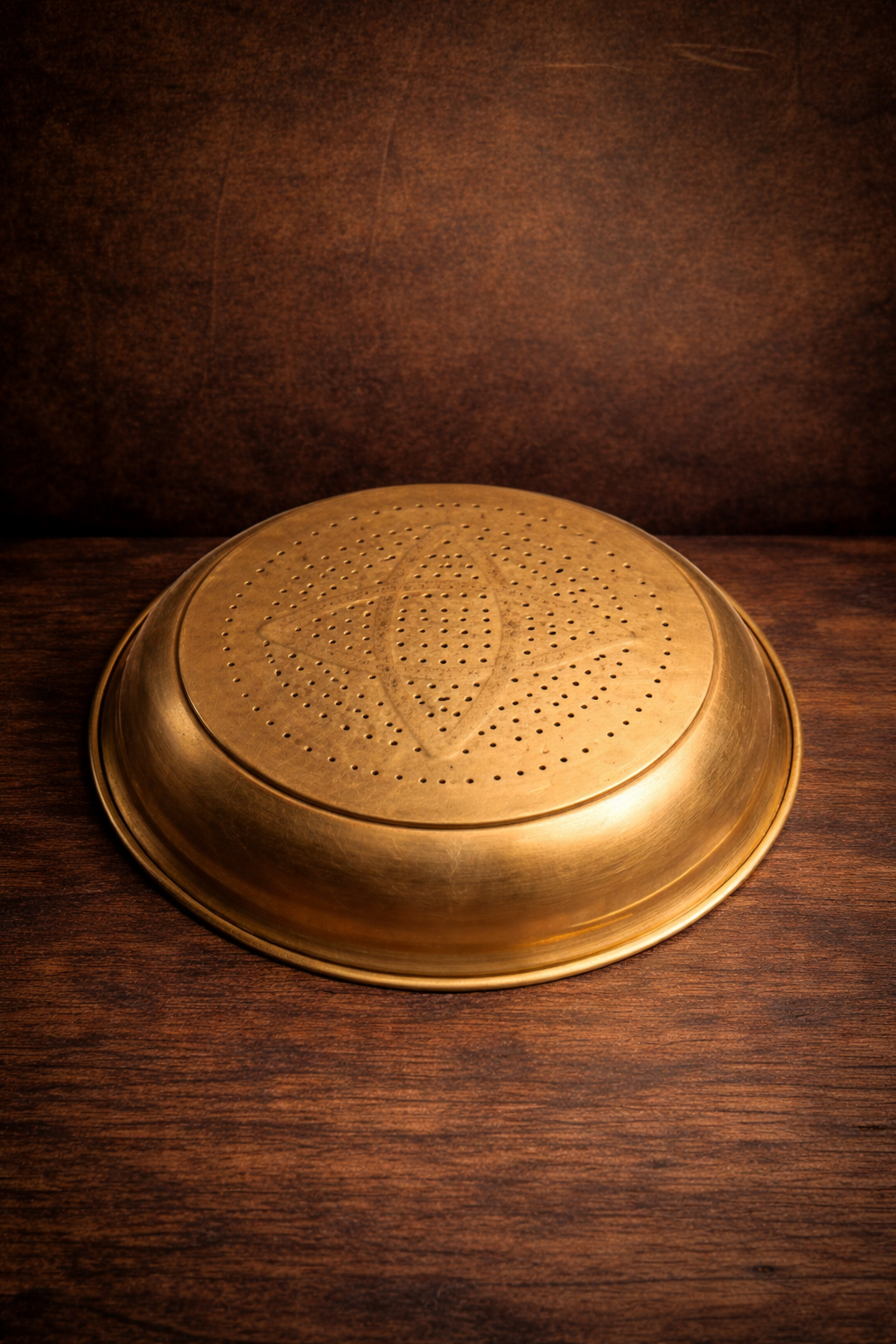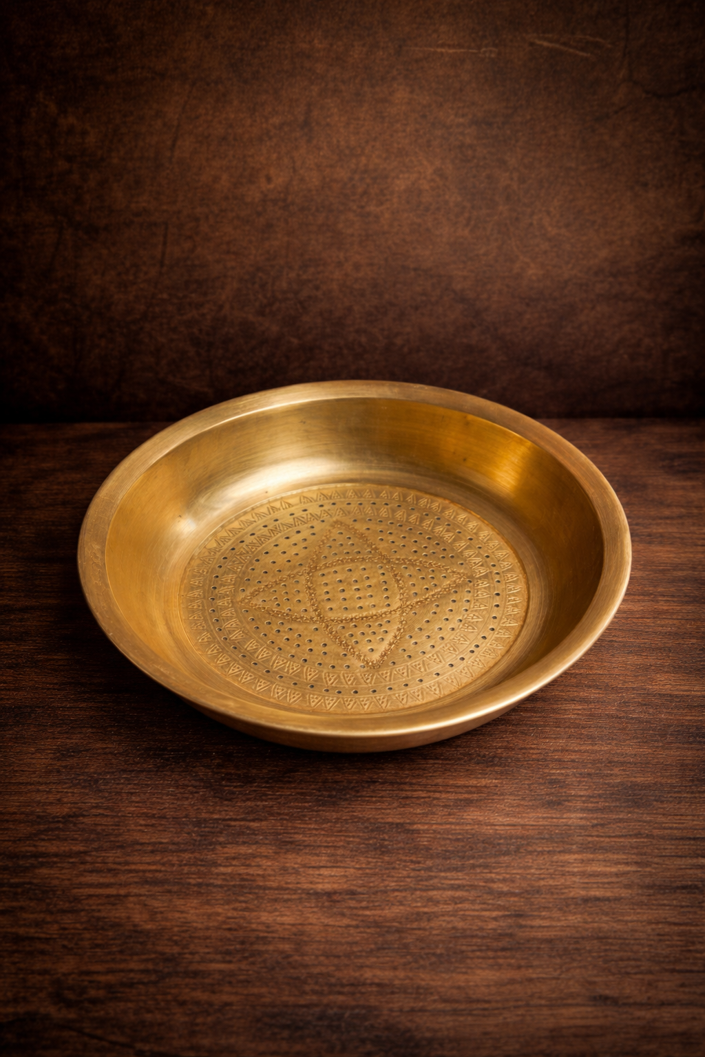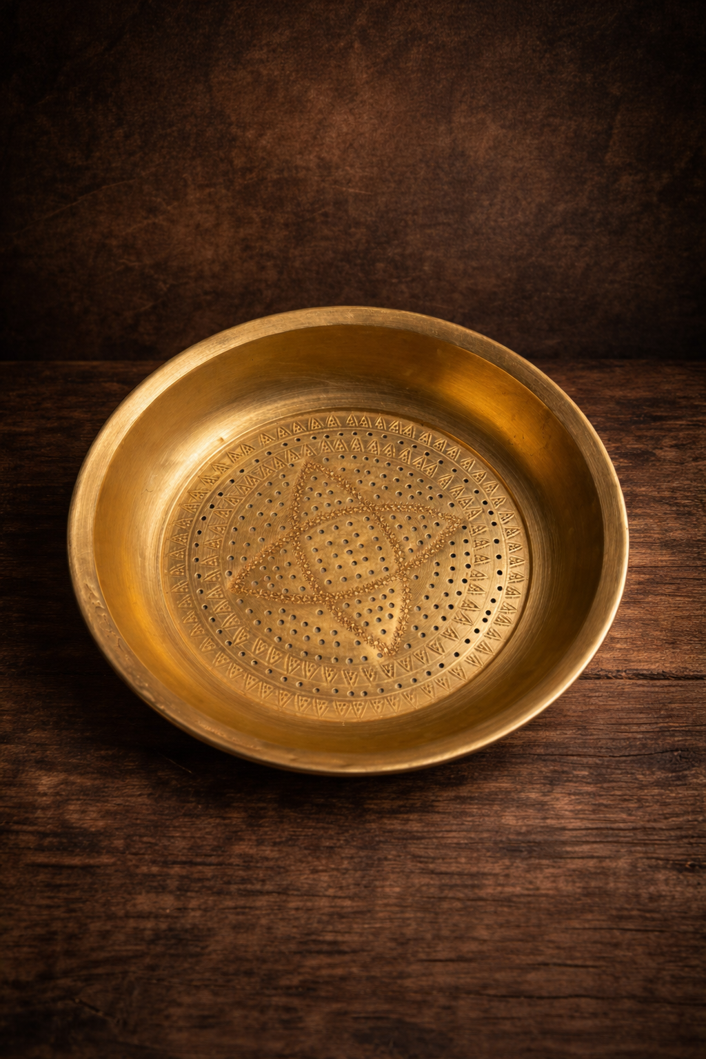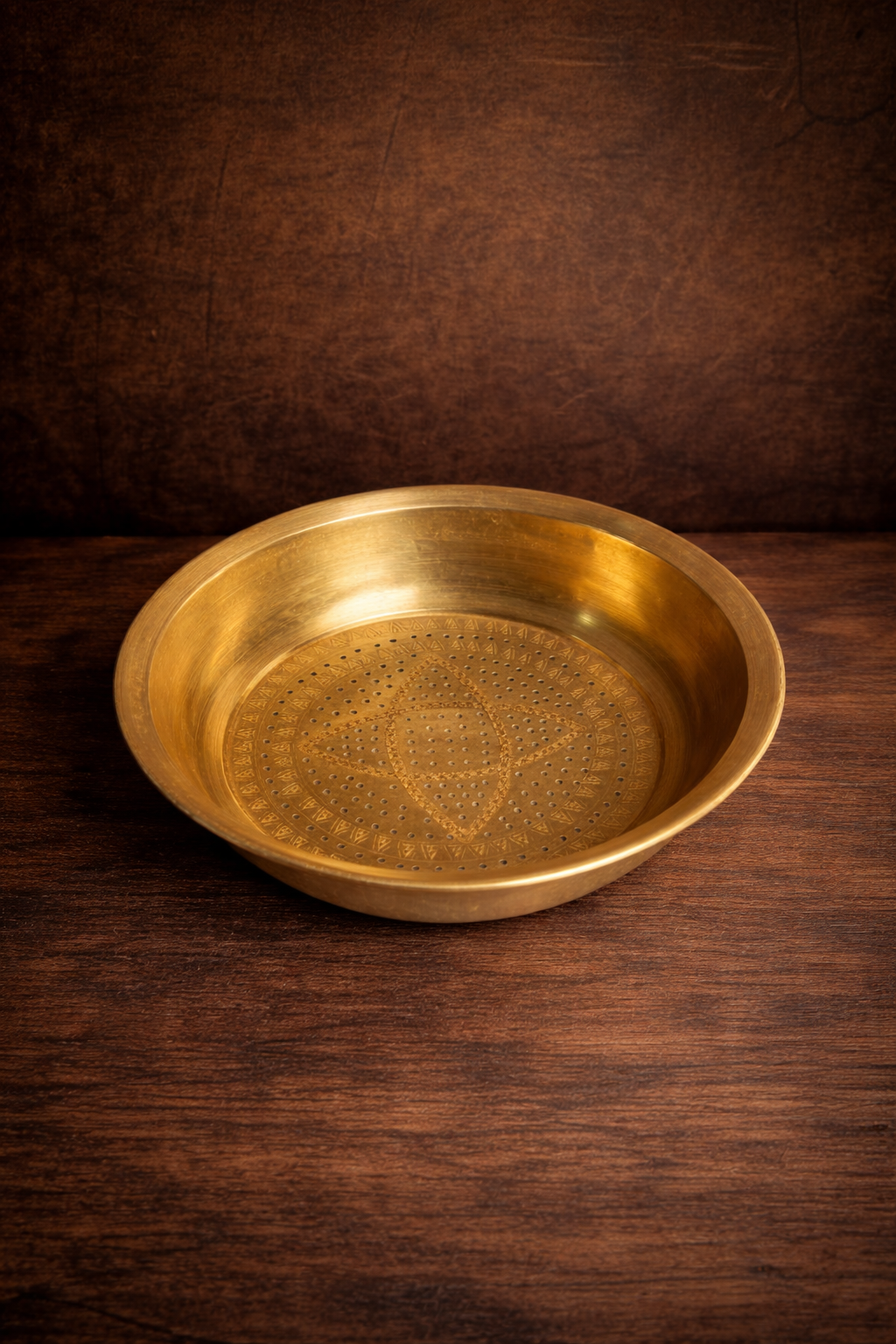 A beautifully handcrafted vintage brass perforated bowl (chalni style) featuring a distinctive geometric pattern at its center. The fine hand-punched perforations combined with traditional engraved border detailing reflect skilled craftsmanship of its time.