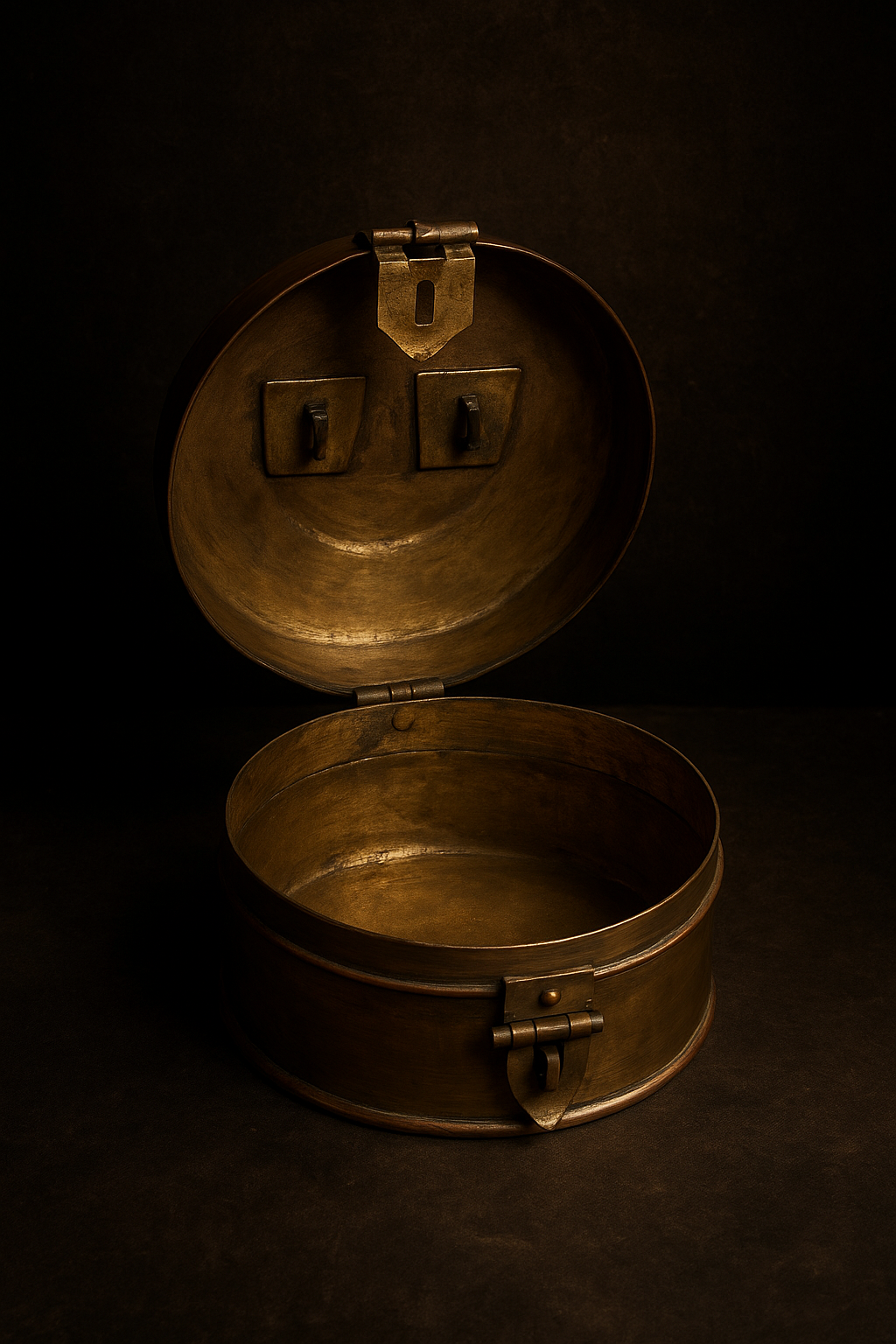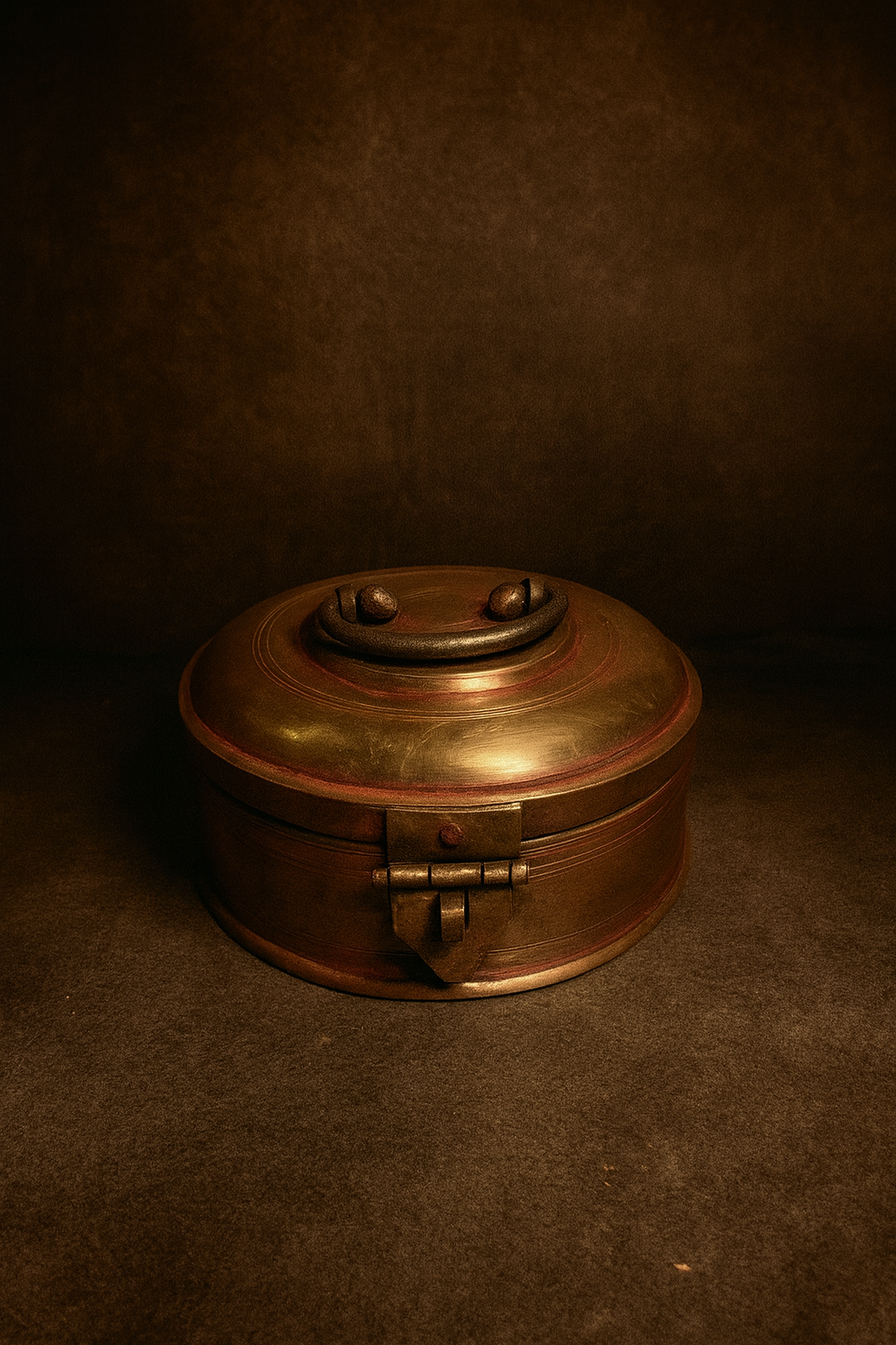Crafted from solid brass, the box displays a naturally aged patina with subtle original red pigment lines (laal rekha), adding character and an authentic old-world charm. The secure front clasp ensures safe storage, while the spacious circular interior makes it suitable for multiple uses.