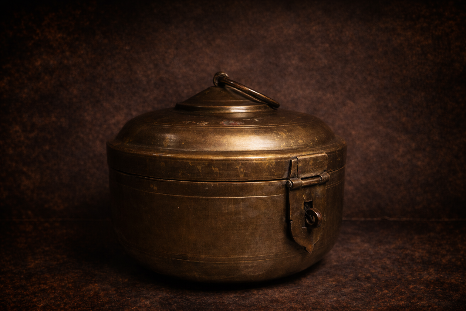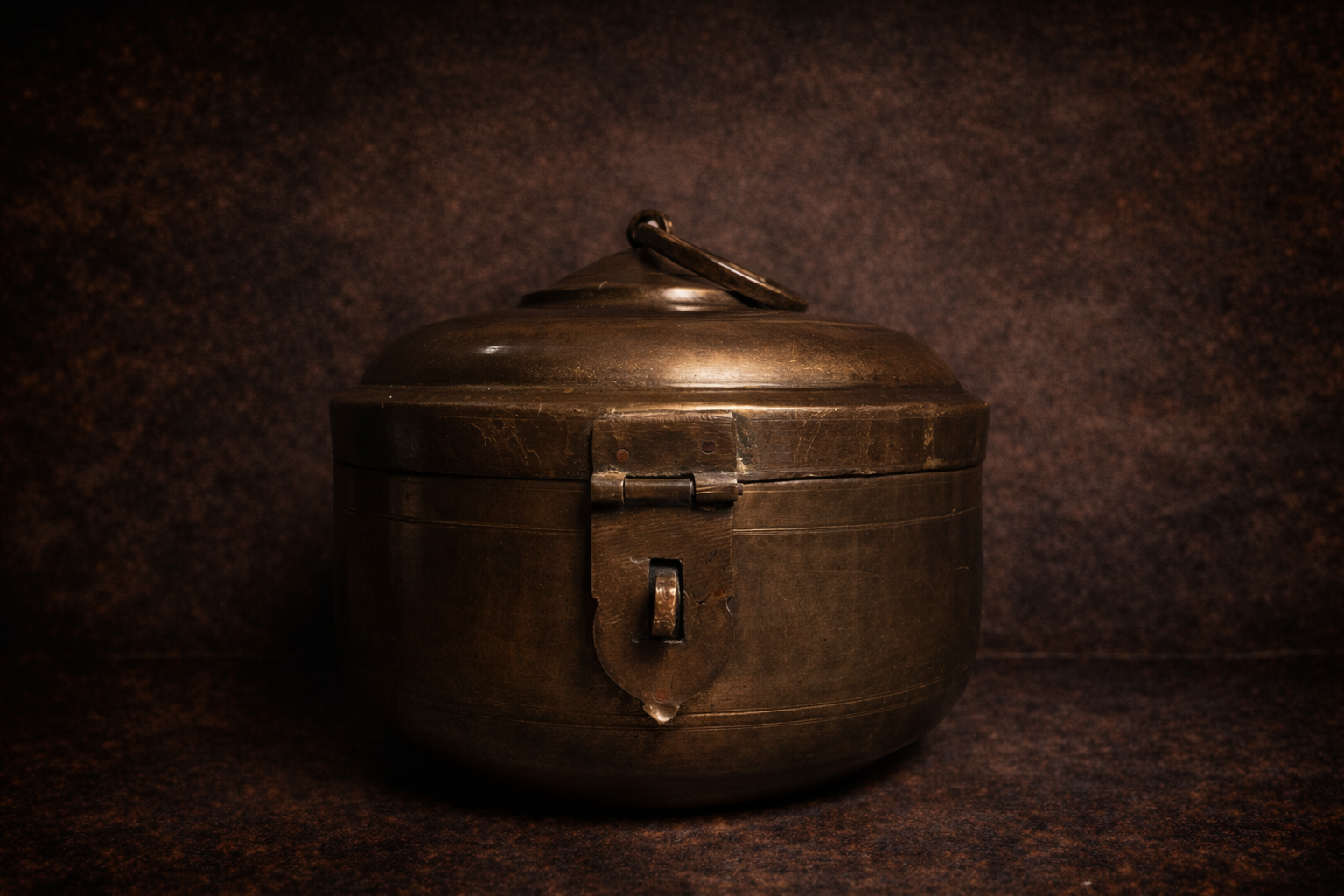 A traditional brass storage box featuring a lockable lid and classic rectangular form, crafted for secure containment of small valuables or essentials. Constructed in solid brass with purposeful design, it reflects enduring utilitarian metalwork. As a collectible, it represents traditional storage solutions and heritage metal craftsmanship.