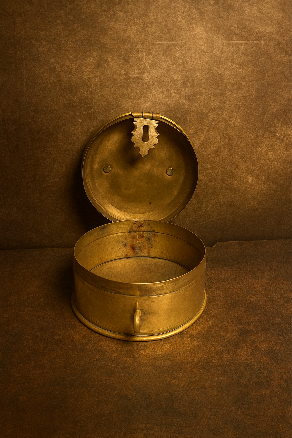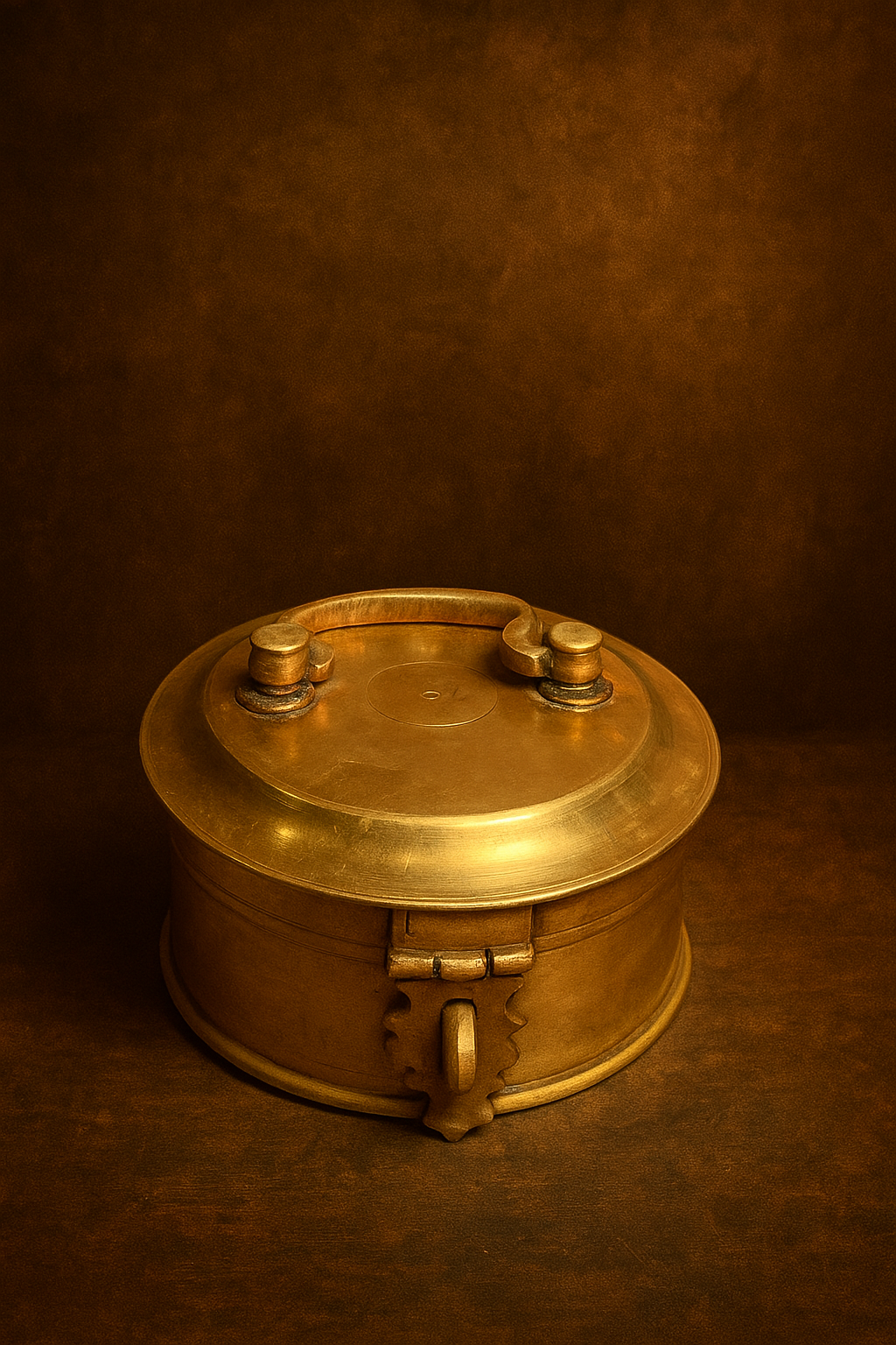 Originally used for storing valuables or special kitchen ingredients, its sturdy build and classic handle design showcase traditional Indian metal artistry.