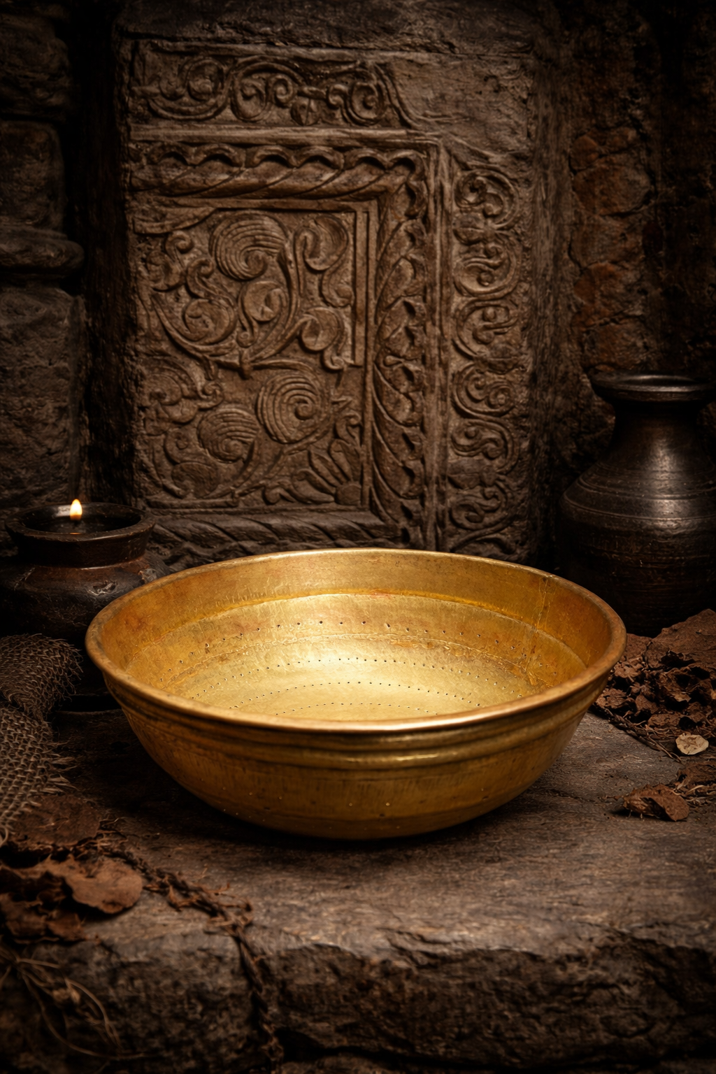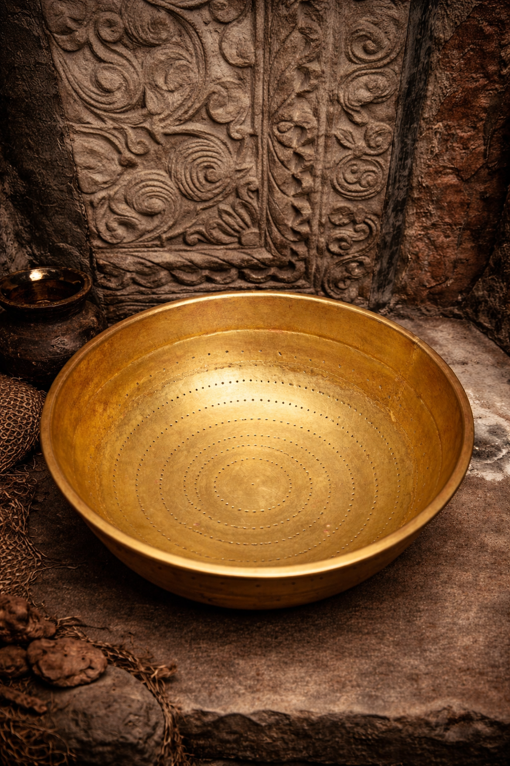 Handcrafted from solid brass, the bowl features perfectly aligned perforations in concentric patterns, allowing water to drain effortlessly while retaining the grains. Its sturdy build and timeless design showcase the durability and craftsmanship of a bygone era.