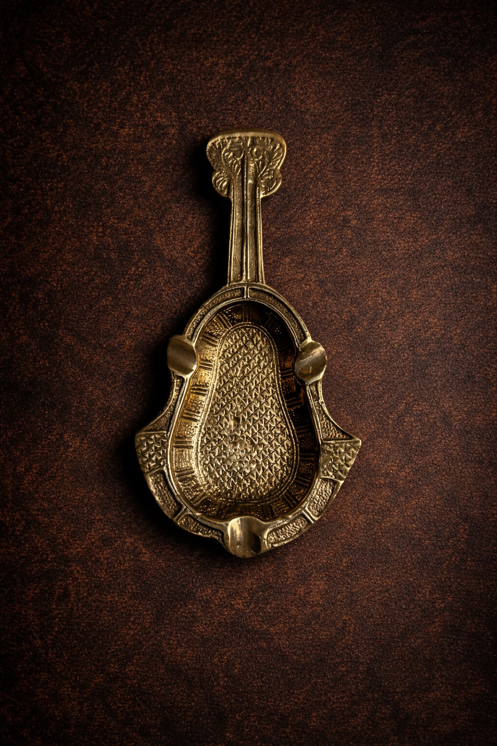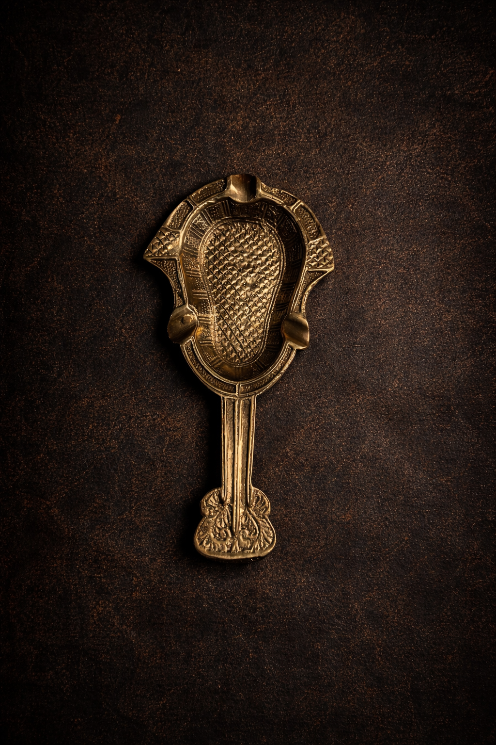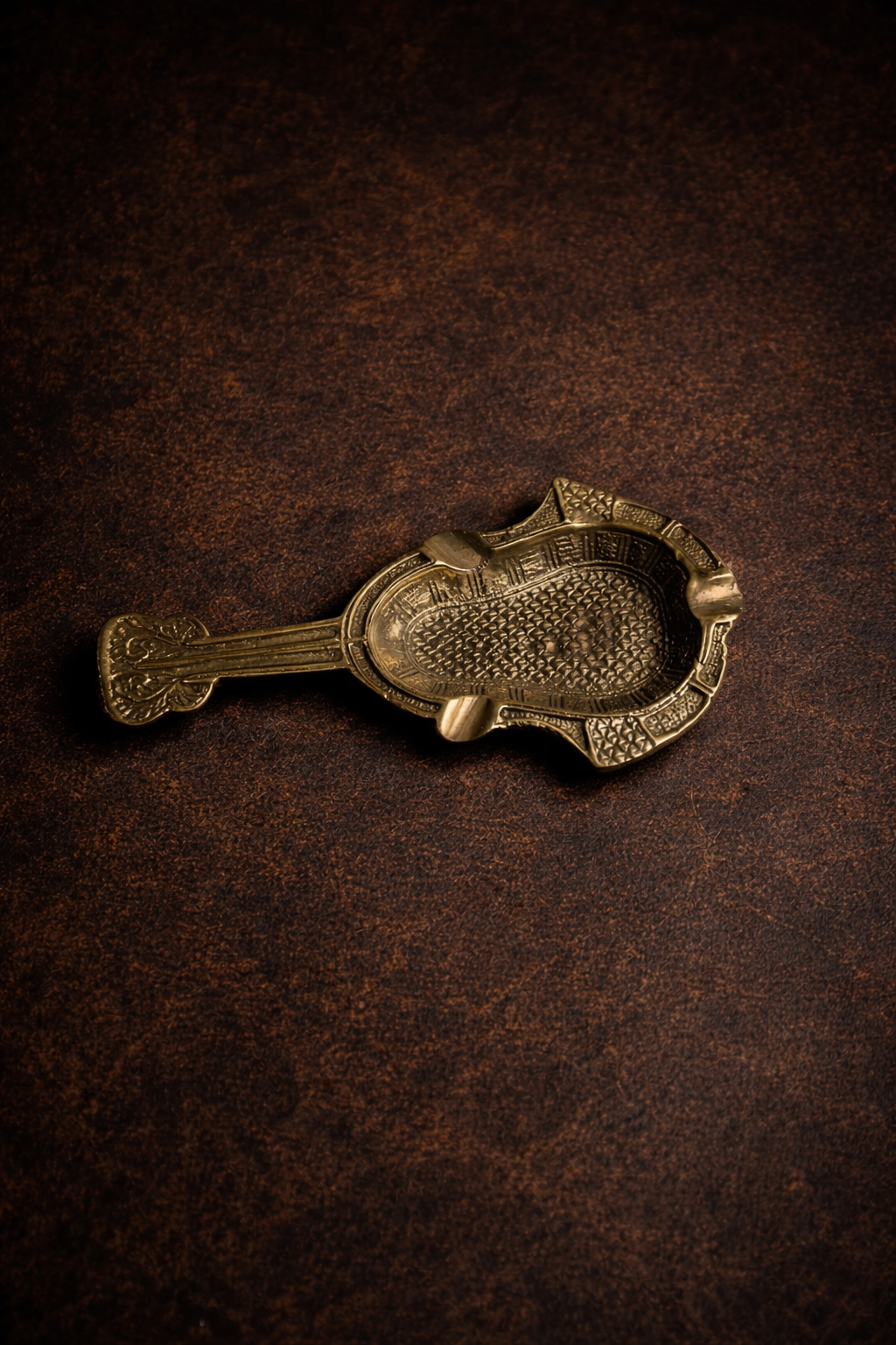 The rich bronze finish, along with its finely textured surface and decorative borders, gives it a luxurious antique presence. The extended handle design makes it stand out from regular ash trays, adding both usability and visual charm.