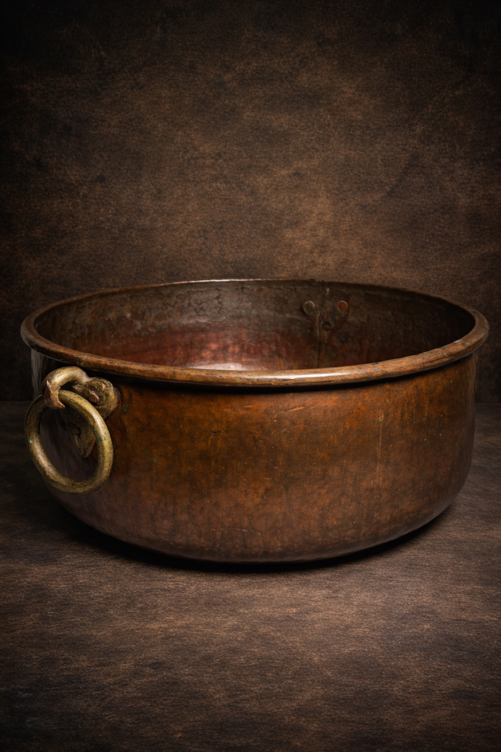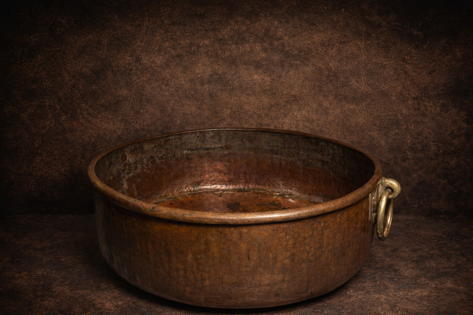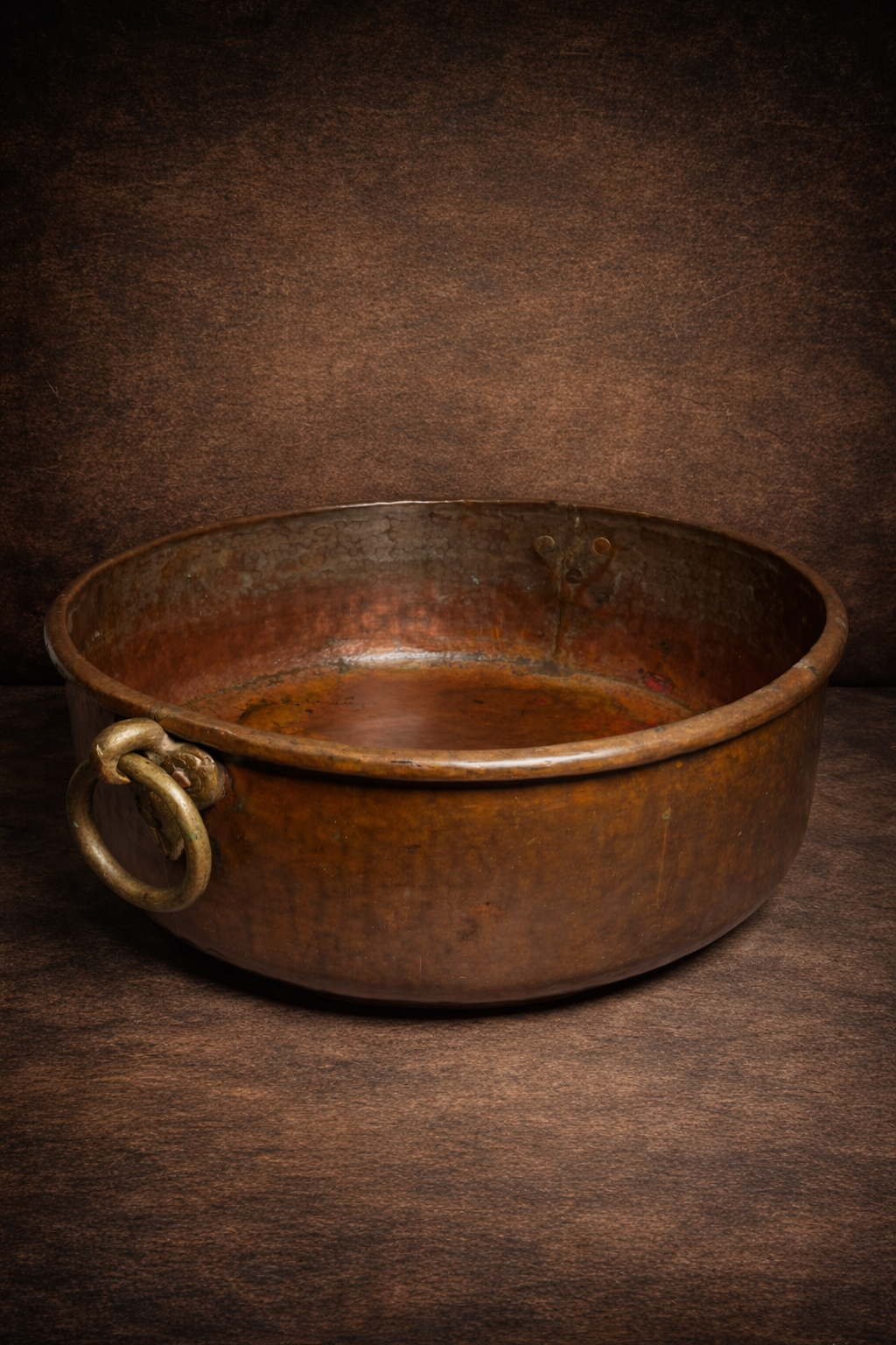 A vintage large-form copper urli vessel with handles, traditionally a South Indian bowl used historically for cooking and utility purposes. With its deep, rounded profile and generous capacity, this copper urli reflects enduring metalwork and classic utilitarian form. Today, such vessels are appreciated for their decorative presence as well as heritage value.