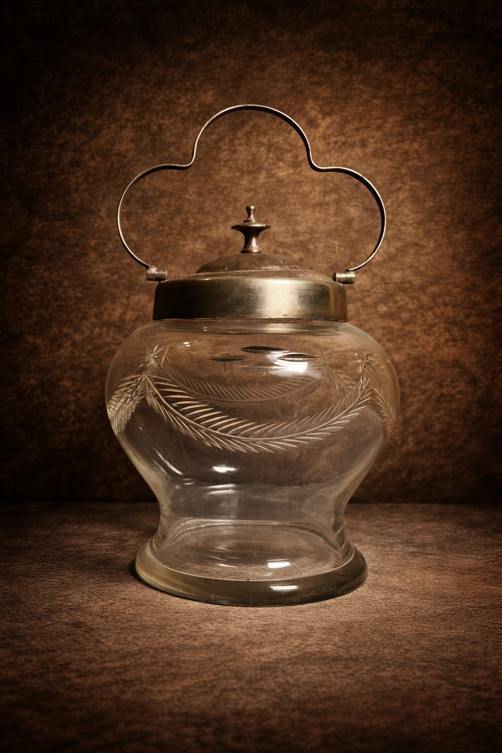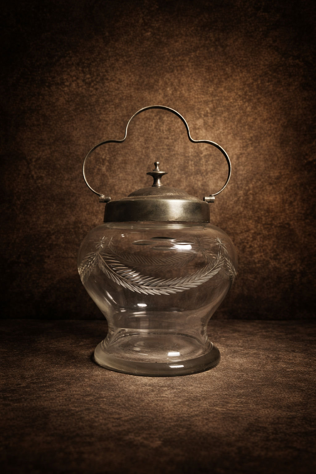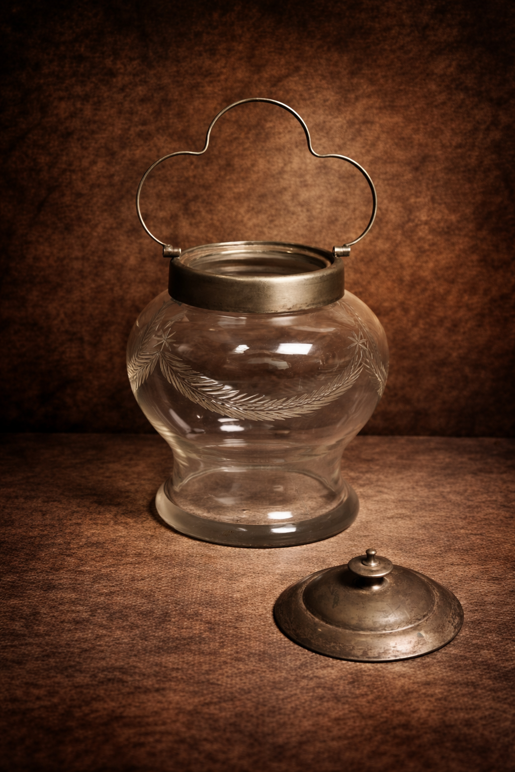 This piece showcases fine glass craftsmanship with delicate engraved patterns, giving it a rich and timeless antique appeal. The sturdy metal lid and unique handle design add to its charm, making it both functional and highly decorative.